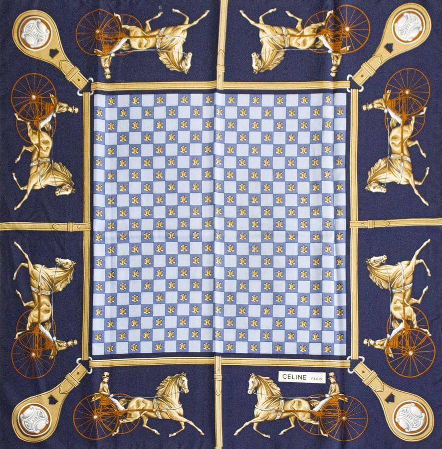 Soie, 89x89 cm. On joint un foulard Céline à décor de chevaux sur fond bleu marine, soie, 88x88 cm.