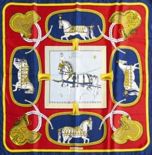 3010. Hermès, "Grand Apparat", foulard à décor de chevaux sur fond bleu foncé et rouge