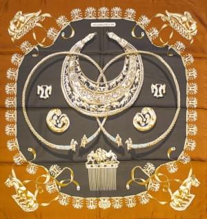 3012. Hermès, "Les cavaliers d'or", lot de deux foulards l'un à motifs dorés sur fond marron et orange et l'autre à motifs dorés sur fond vert