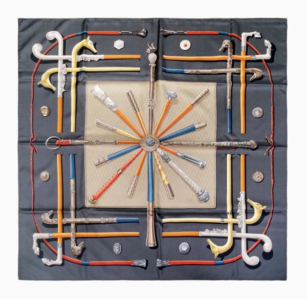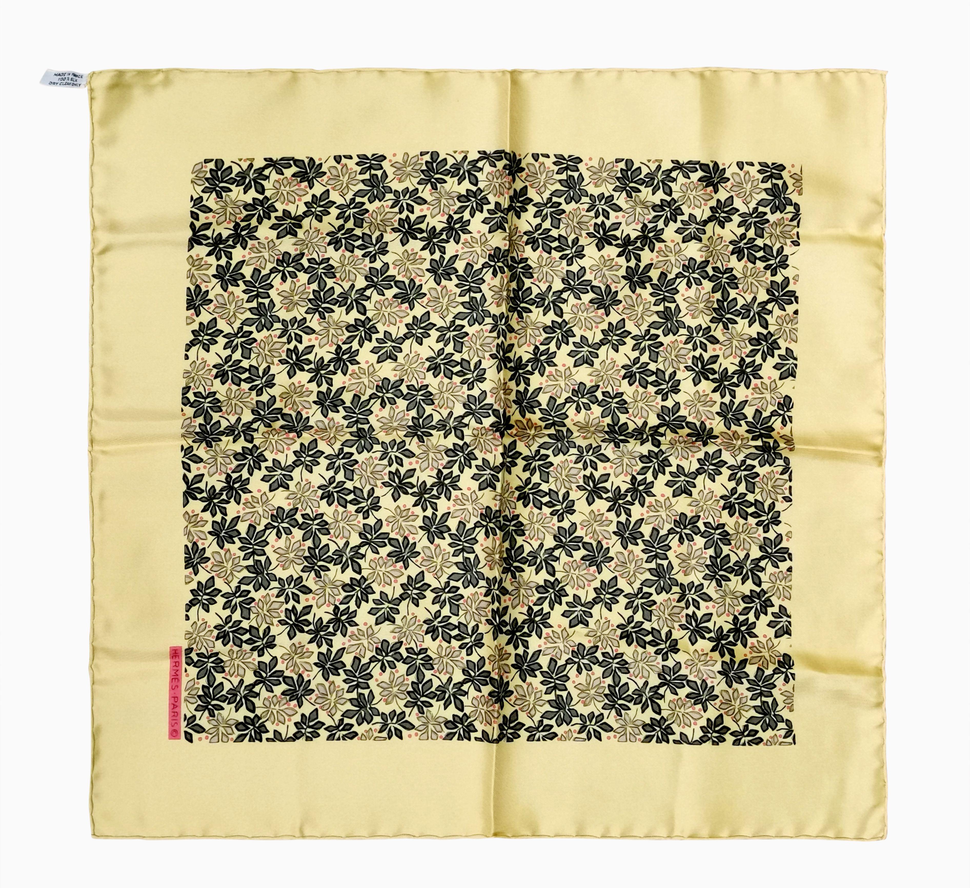 Le premier à décor de cravaches sur fond gris et beige et la deuxième à décor de feuilles sur fond jaune, soie, 88x88 et 42x42 cm
