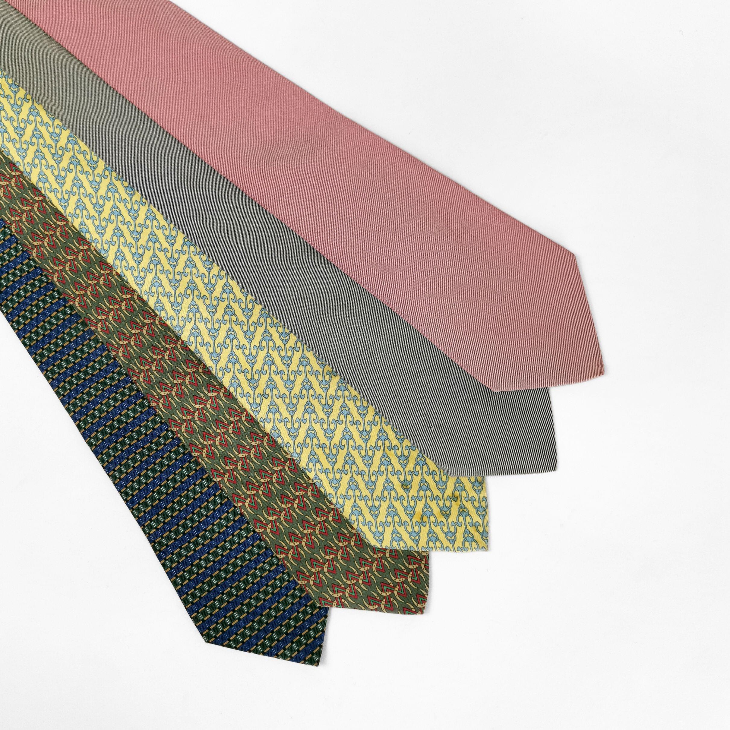 Trois à motifs géométriques, et deux unies à fond rose et à fond gris, soie, L 143 à 158 cm
