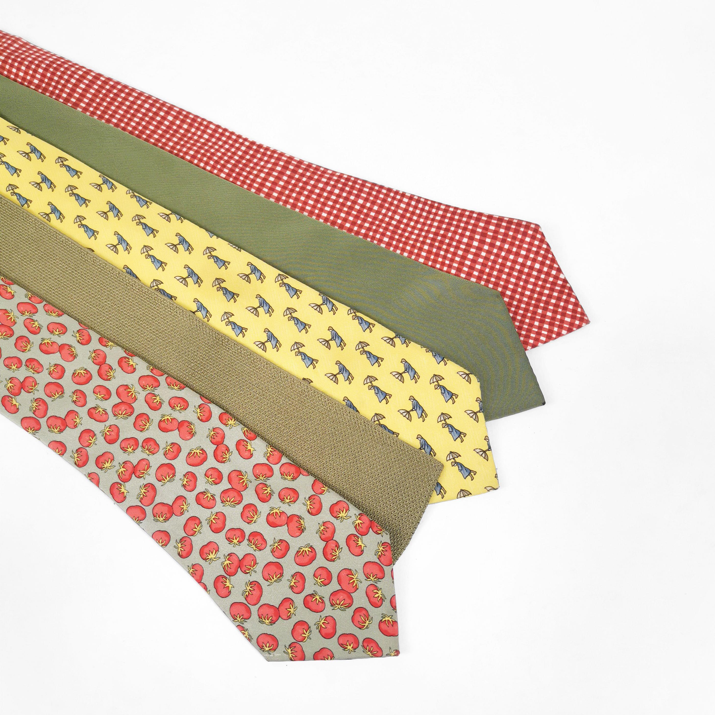 Deux à motifs de tomates et parapluies, deux vertes et une à "carreaux Vichy", soie, L env. 150 cm