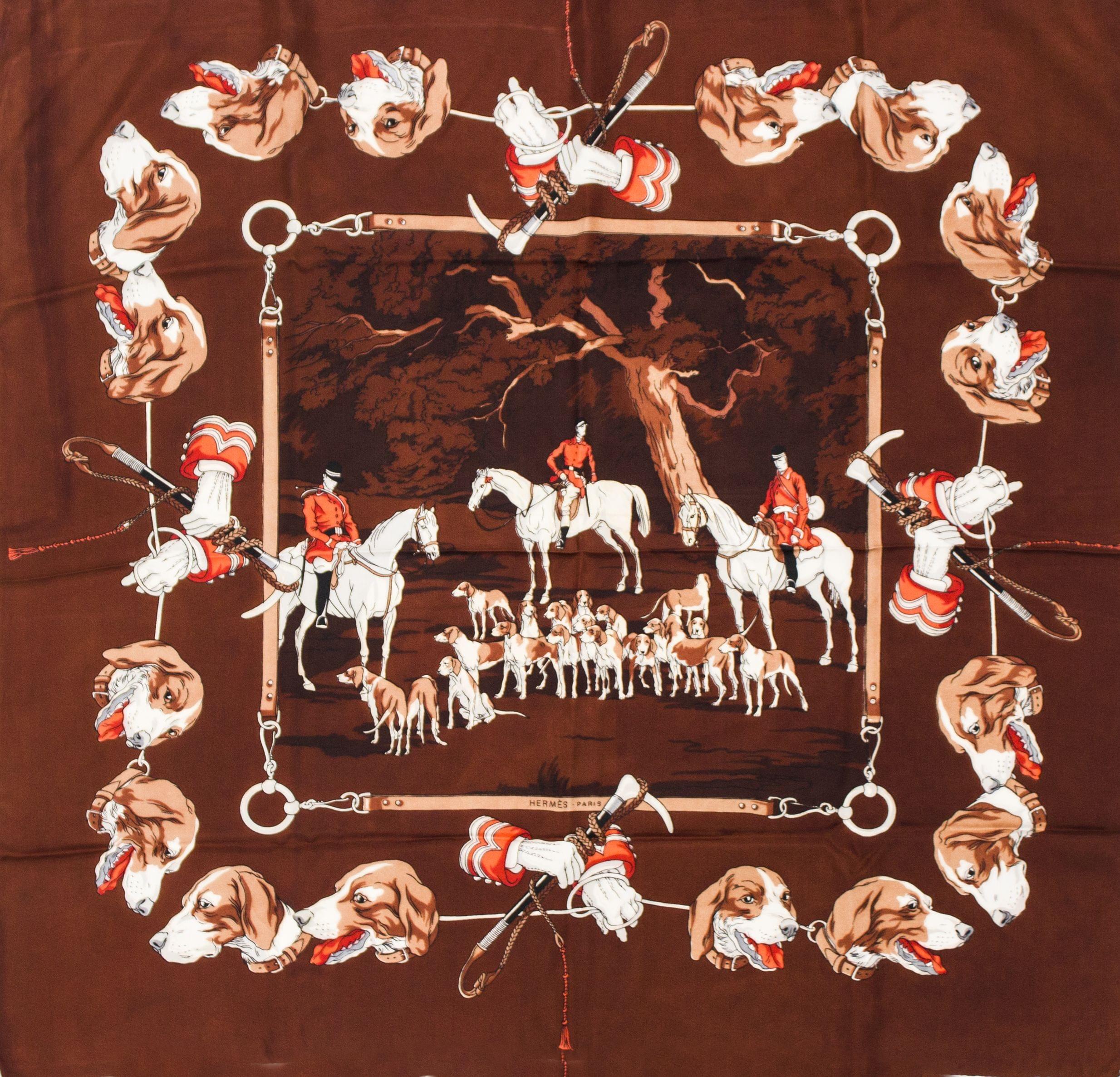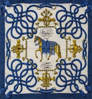 Un marron à décor de scène de chasse, l'autre blanc et bleu à décor d'un cheval, soie, 75x80 et 85x82 cm