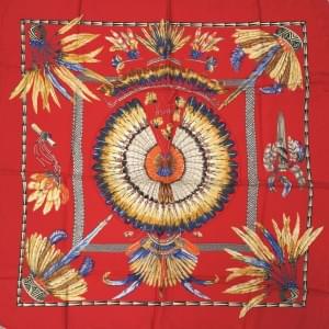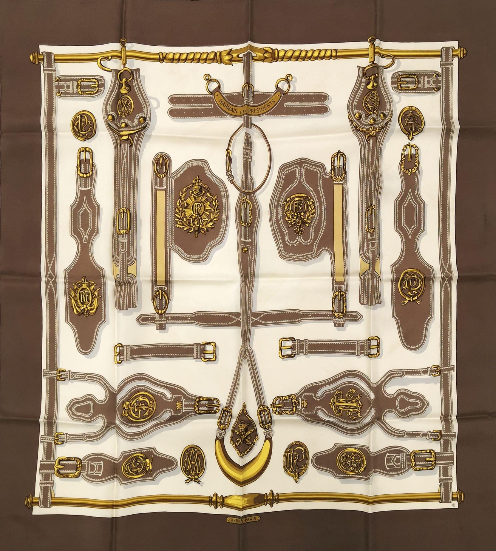L'un "Brazil" sur fond rouge et l'autre "Harnais des Présidents" à bordure marron, soie, env. 87x87 cm