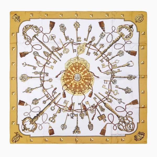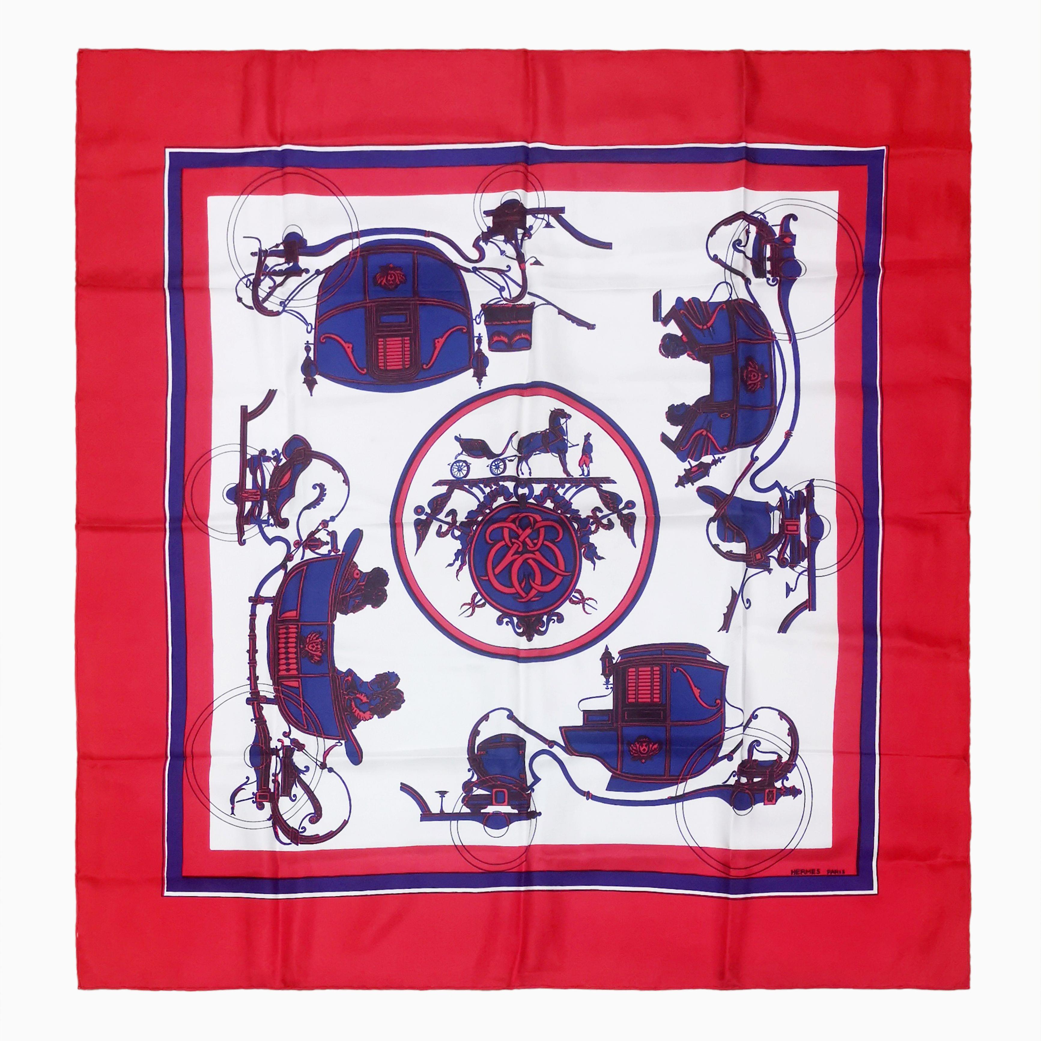 Le premier à décor de carosses bleus et rouges sur fond blanc, bordure rouge, le deuxième à décor de clés dorées sur fond blanc, bordure dorée, soie, 88x88 cm