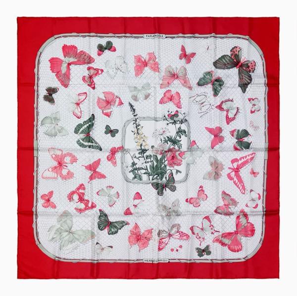 Le premier à décor de chevaux sur fond camel et bordure chocolat et le deuxième à décor de papillons sur fond blanc et bordure rouge, soie, 88x88 cm