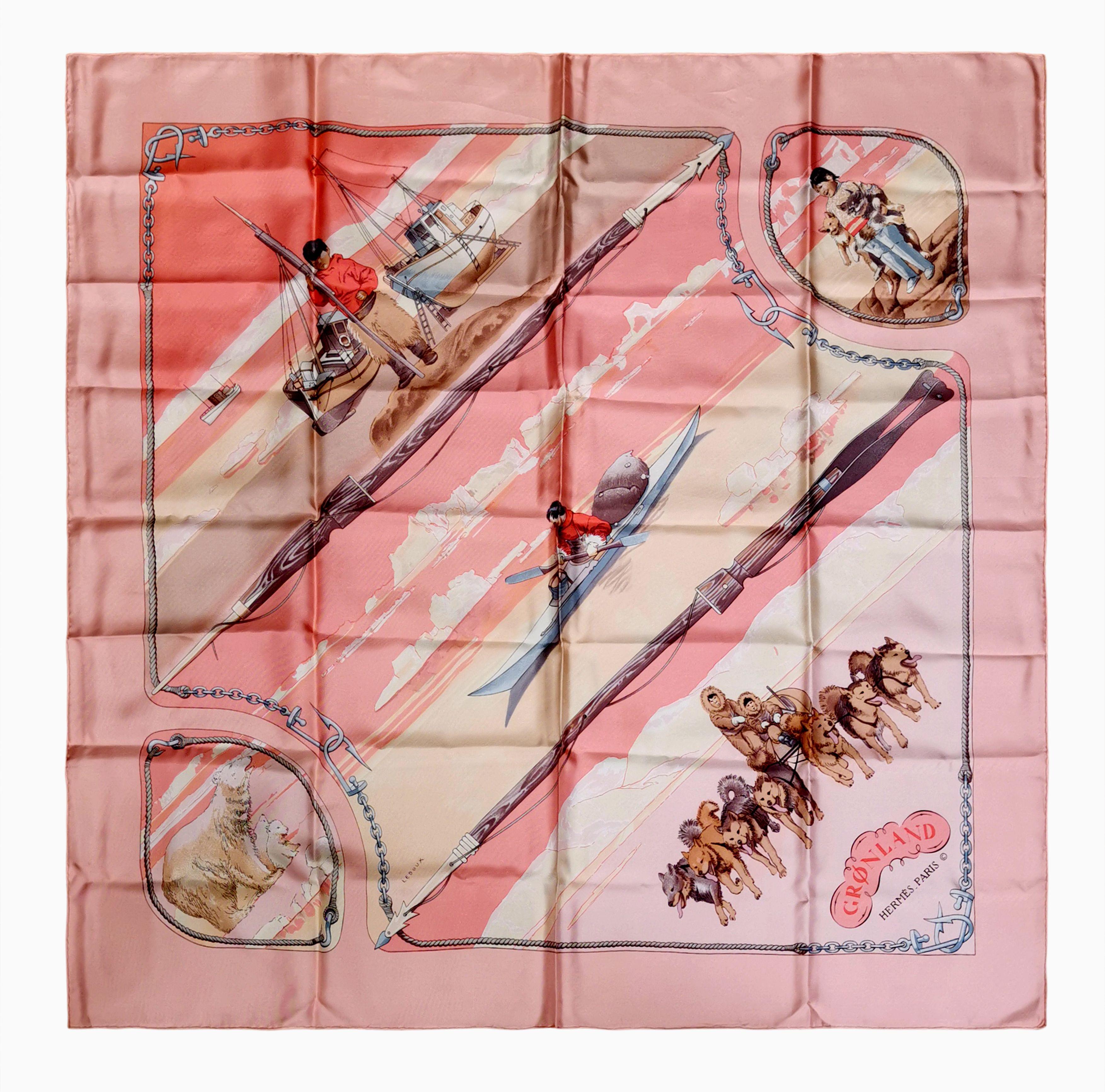 Le premier à décor de cavaliers sur fond blanc et bordure rose et le deuxième à décor d'inuits sur fond saumon, soie, 88x88 cm