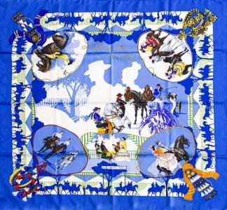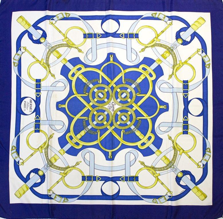 3015. Hermès, lot de deux foulards, l'un "Feria de Sevilla" à fond bleu et l'autre "Eperon d'or" à fond bleu et blanc