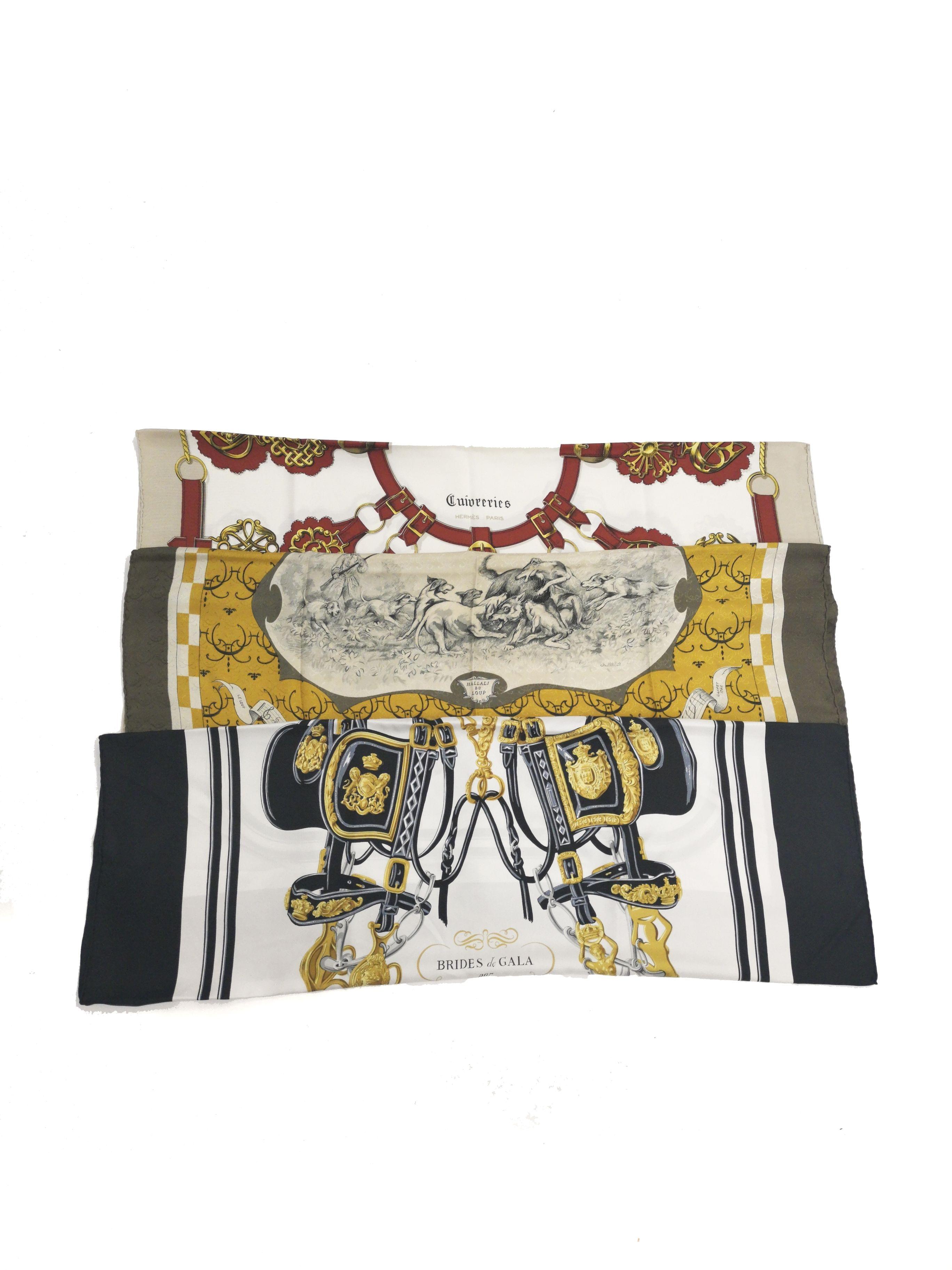 L'un "Brides de Gala" à décor d'harnachements sur fond crème et à bordure bleue marine, l'autre "Cuivreries" à bordure beige et le dernier "Hallali du loup" à bordure kaki, soie, 88x88 cm, 86x86 cm et 84x85 cm. Provenance: collection Pernet-Villaverde