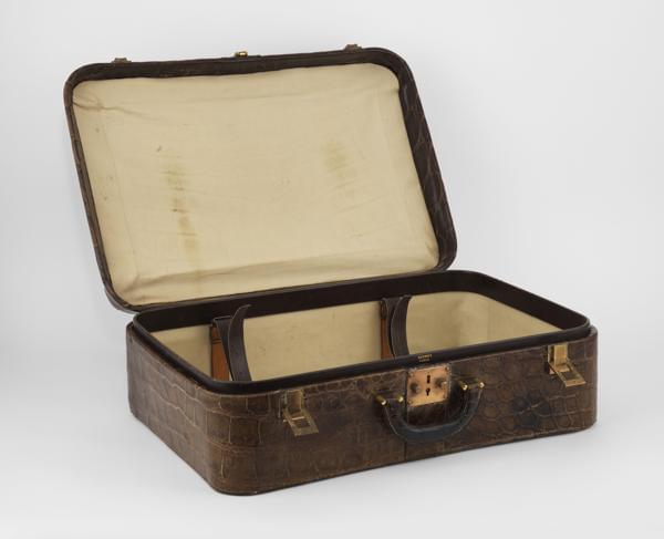Crocodile chocolat, intérieur en toile beige, garniture en métal doré avec initiales FF, 52x16x38 cm