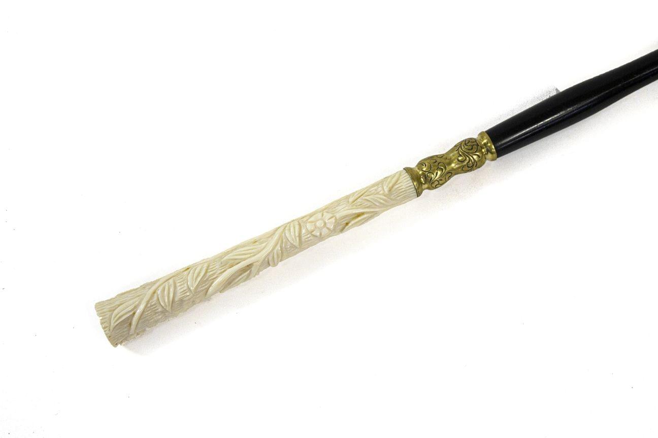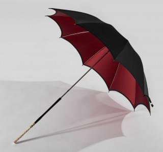 Tissu noir, intérieur rouge, manche en os sculpté surmonté d'une bague en métal doré et d'un manche en bois, H 90 cm