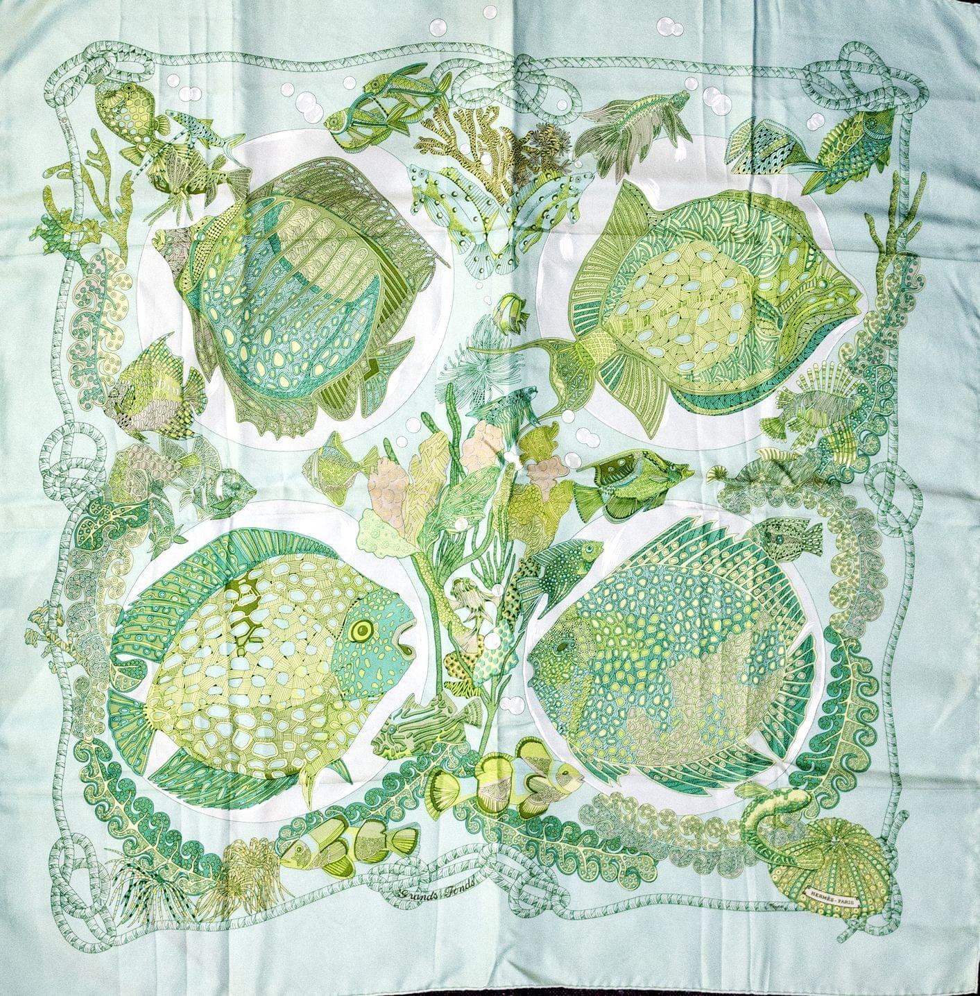 3000. Hermès Paris, foulard "Grands fonds" à décor de poissons stylisés sur fond vert d'eau