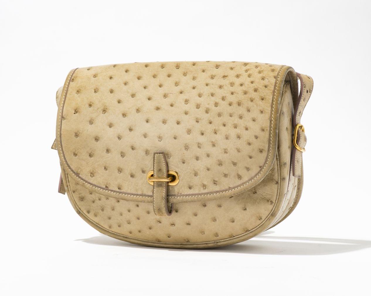 Cuir d'autruche gris, fermoir à languette, anse à bandoulière, 19x23 cm