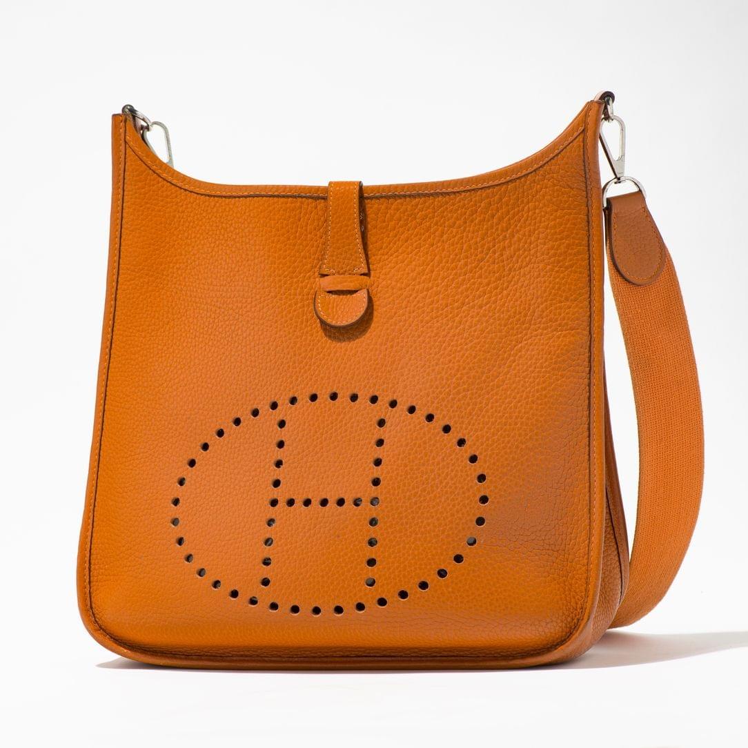 Cuir grainé orange, fermoir languette à pression, bandoulière, 30x32 cm
