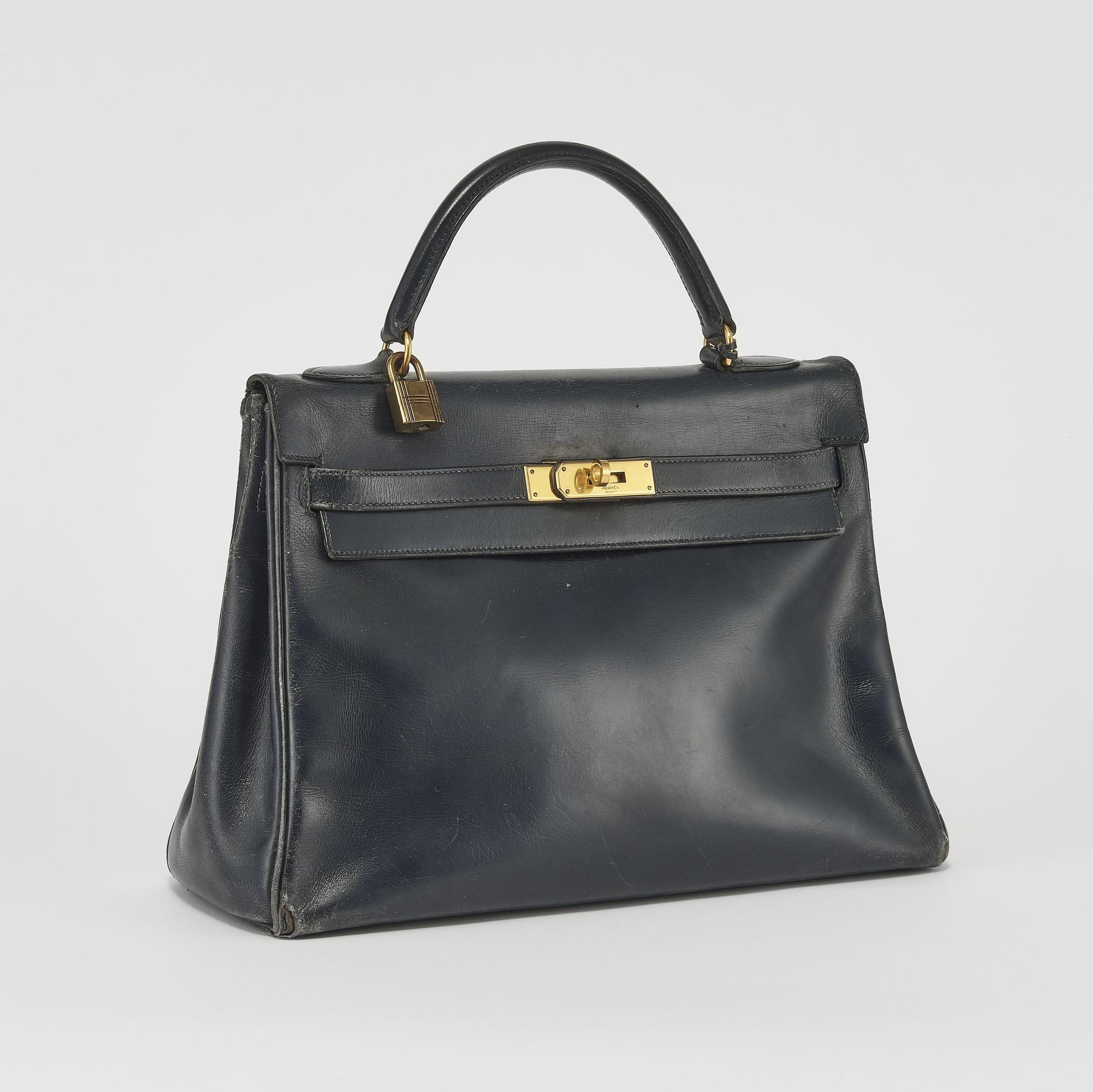 Cuir grainé bleu, intérieur en toile monogrammée blanche, garnit...