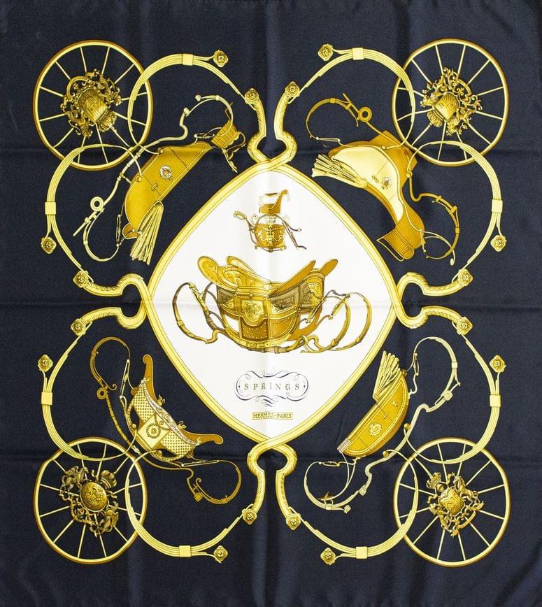 3020. Hermès, "Springs", foulard à décor d'attelage doré sur fond noir et crème