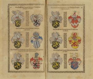 Cinq parties en un volume in folio, vélin sur ais de bois, à décor estampé. Edition originale, rare et recherchée. Page de titre en rouge et noir. Grande vignette en page de titre. Impression en gothique. Les deux derniers feuillets concernent l'errata. Edition illustrée d'un tableau dépliant et de très nombreuses armoiries in-texte ainsi que de planches contenant des armoiries (environ 700 armoiries) ; quelques figures in-texte (stèles, tables). Blasons réhaussés en couleurs (petite déchirure à une planche).
