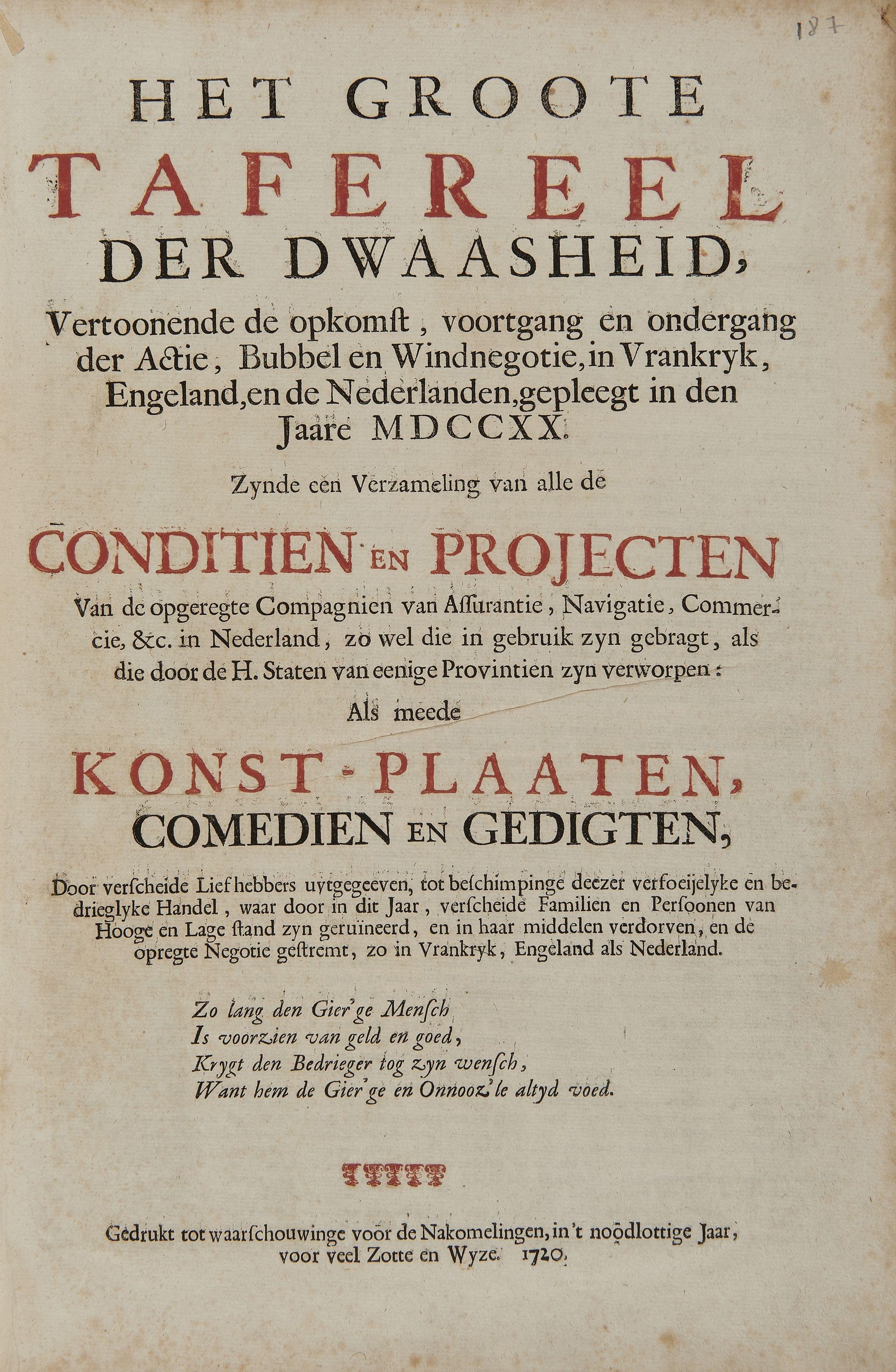 VERTOONENDE DE OPKOMST, VOORTGANG EN ONDERGANG DER ACTIE, BUBBEL EN WINDNEGOTIE, IN VRANKRYK, ENGELAND, EN DE NEDERLANDEN, GEPLEEGT IN DEN JAARE MDCCXX. Amsterdam,1720;