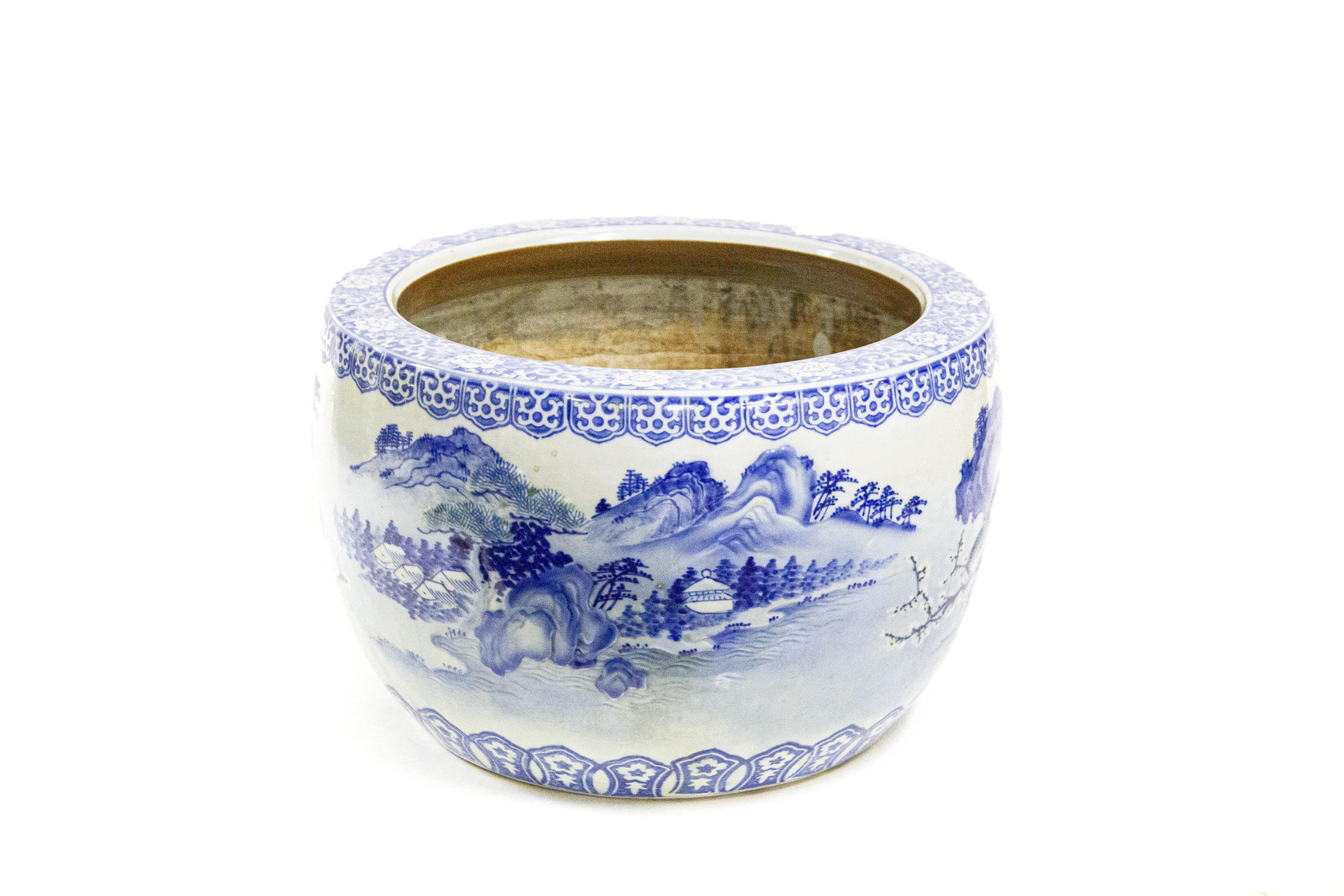 Porcelaine émaillée bleu blanc à décor de paysages, D 43 cm