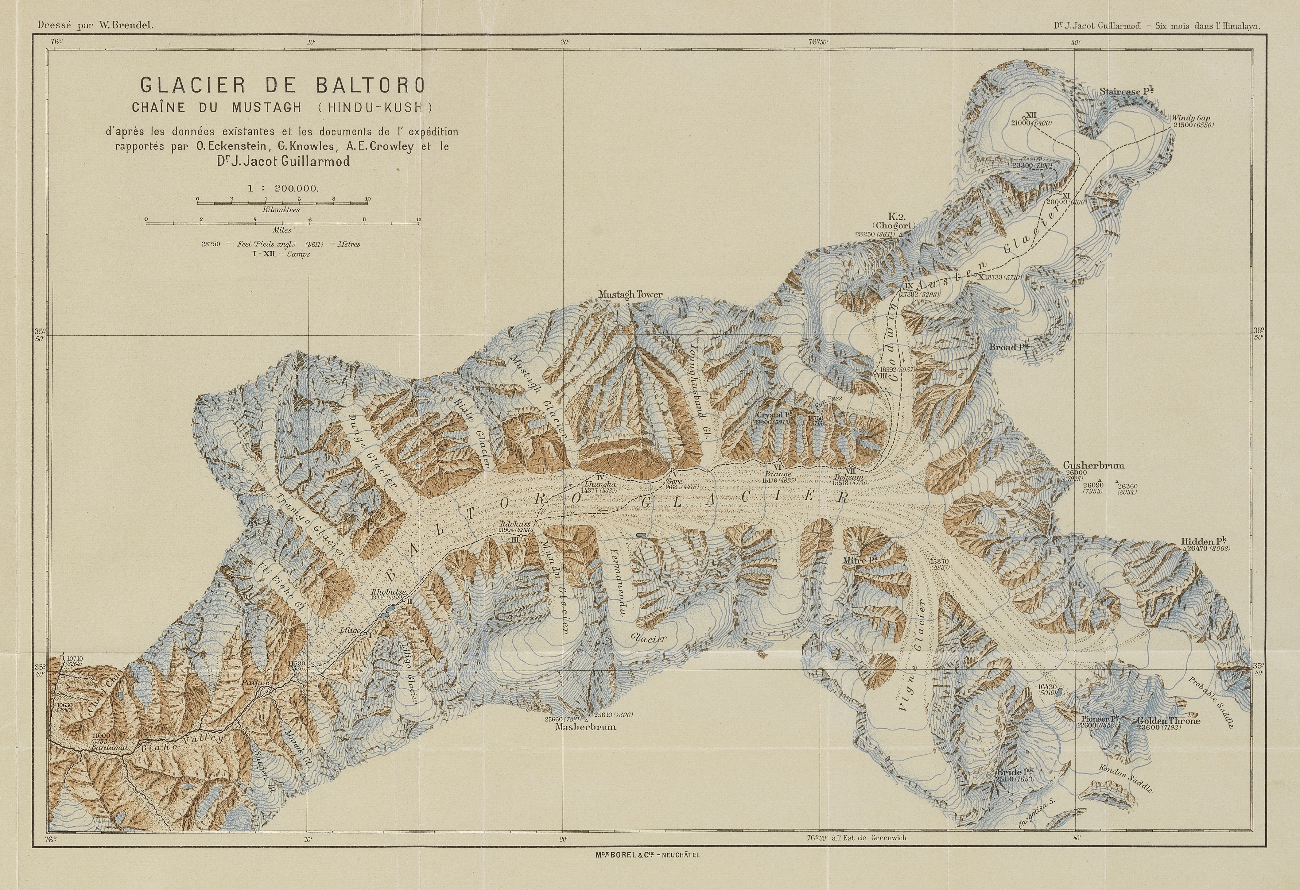 Neuchâtel, Sandoz, s.d. (1904) ; in 8°, demi chagrin rouge à coins, monogramme doré frappé sur le coin supérieur droit. Ouvrage de légende relatant la première expédition dans l’Himalaya ; il est illustré de 269 photographies dans le texte et de 10 planches hors-texte en phototypie, de trois cartes et d’une planche panoramique.