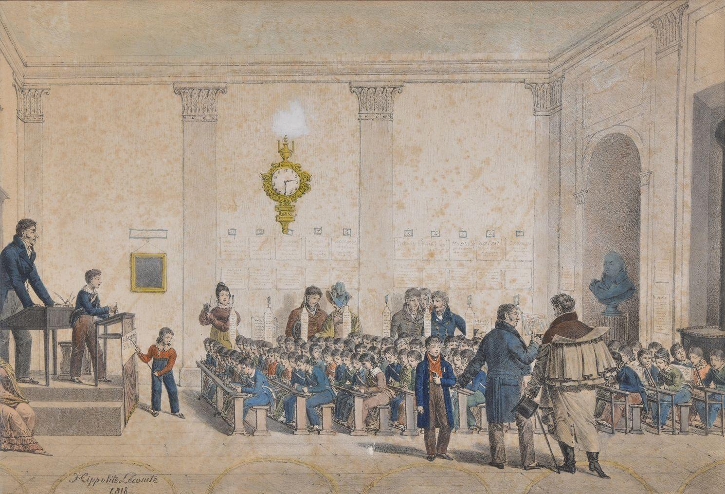 Salle de classe sous la Restauration, dessin à l'encre, aquarelle et gouache sur papier, signé et daté 1818, 32x47cm, cadre d'époque Empire