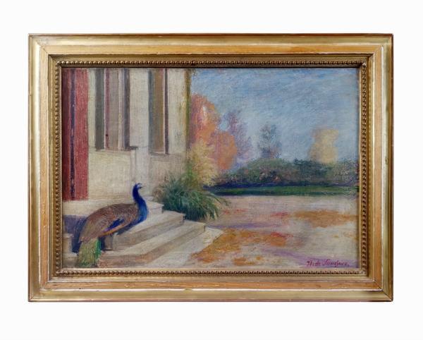 Paon devant un palais, huile sur toile, signée, 49x74 cm