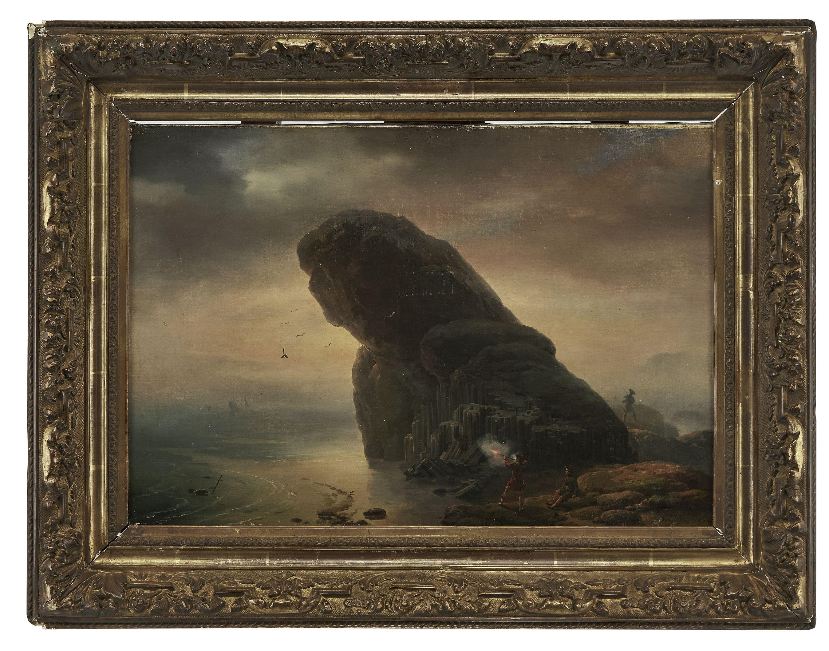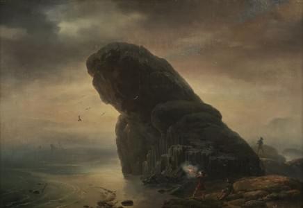 Chasseurs sur une côte rocheuse, huile sur toile, signée et datée 1824, 38x56,5 cm, étiquette au dos sur le châssis de la Galerie Heim-Gairac. Ce paysage n'est pas sans évoquer la chaussée des géants, fameuse formation volcanique située sur la côte d'Irlande du Nord. Dans l'ouvrage "Les Vernet" de Monsieur Armand Dayot, une "chasse au brouillard" est répertoriée comme ayant été vendue le 4 janvier 1824 à un certain M. Schroth.