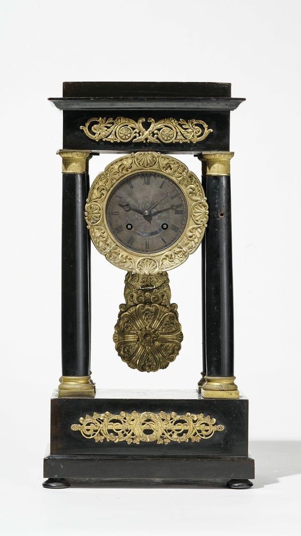 Bronze et bois noirci à décor de fleurs, cadran émaillé blanc, H 48 cm