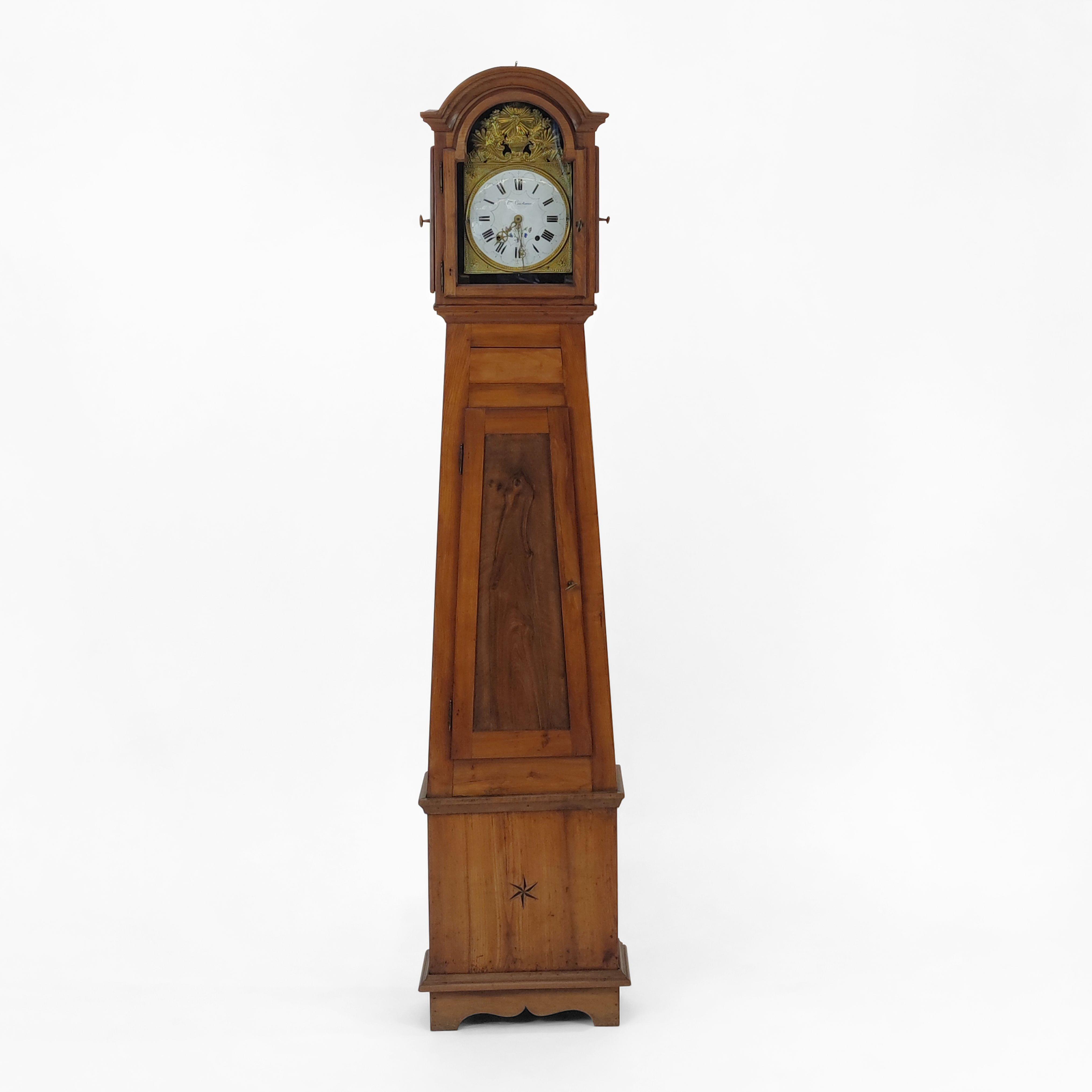 Caisse en bois fruitier, cadran émaillé blanc signé Anne Constanze, H 230 cm