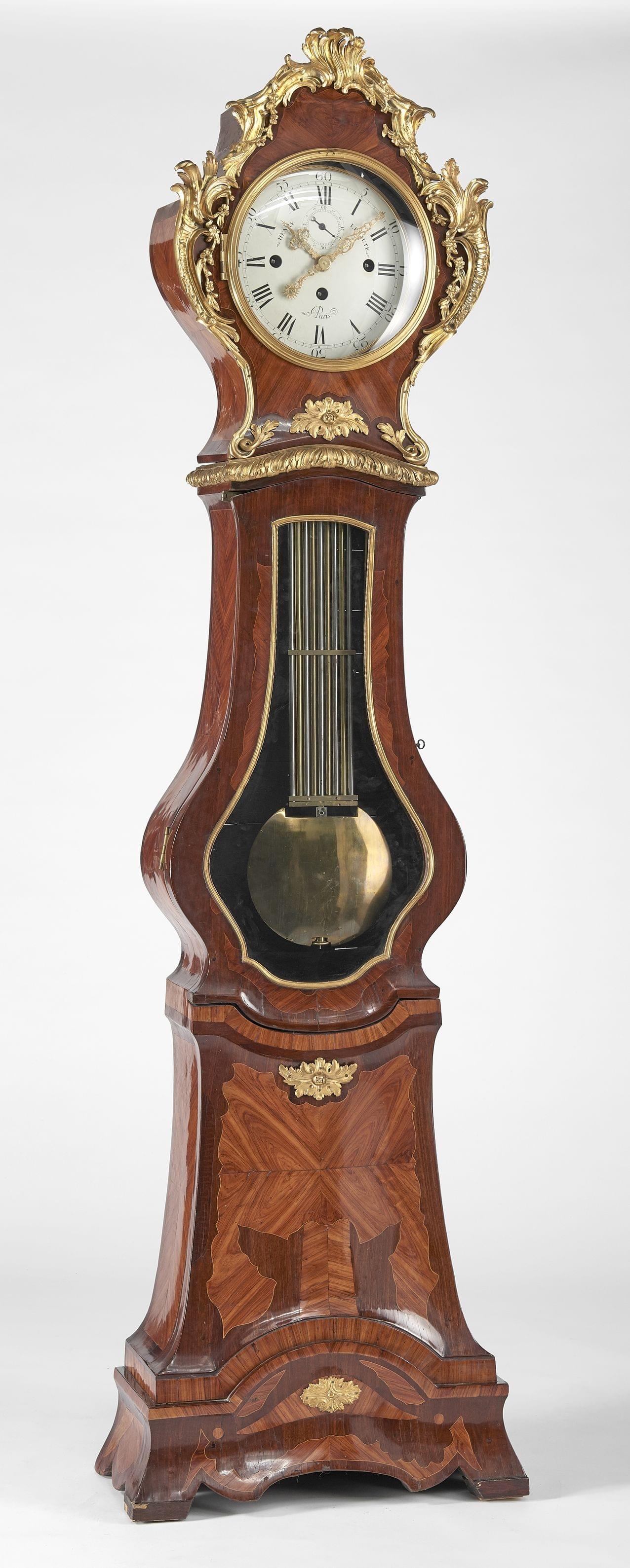 Bois de rose et bois de violette, bronze doré, cadran signé Henri Lepauté à Paris, H 217 cm