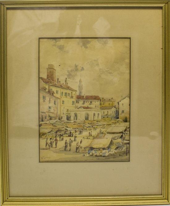 Scène de marché, aquarelle sur papier signée, 30x20 cm