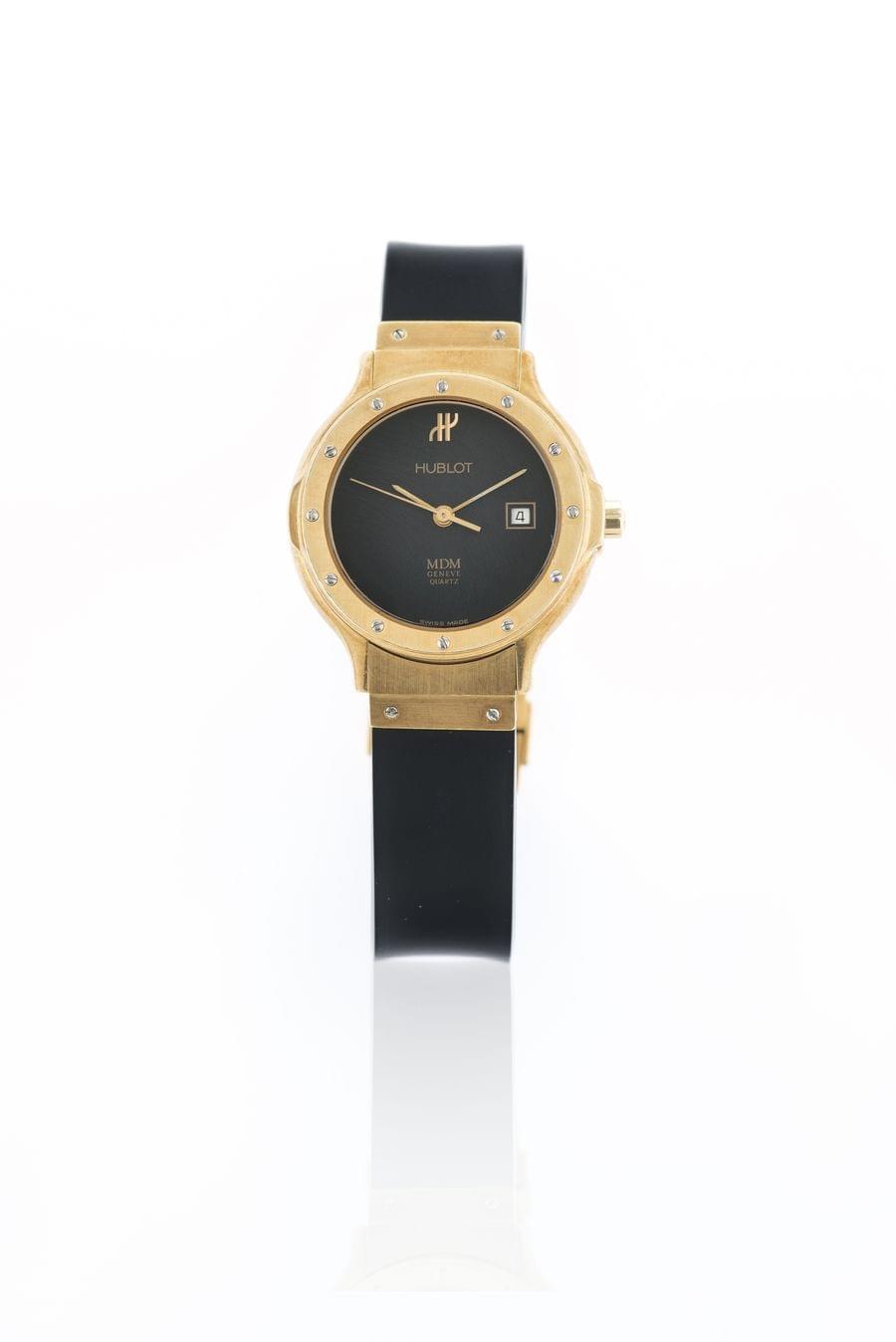 Cadran noir, aiguilles dorées, date à guichet à 3h, or 750, D 25 mm, poids brut 41 g