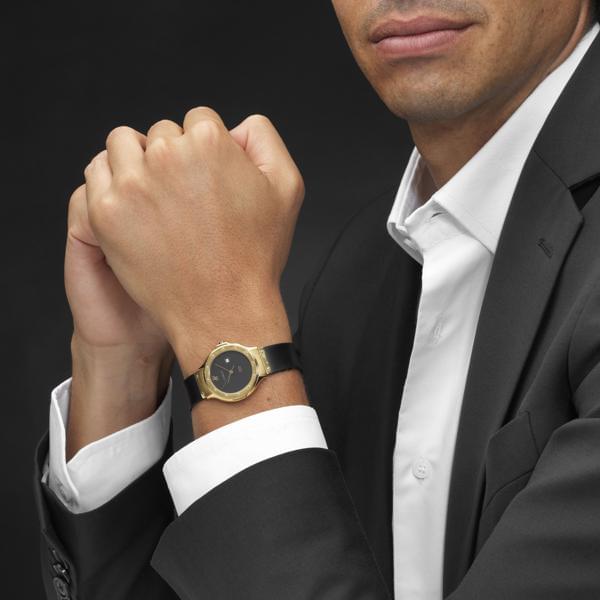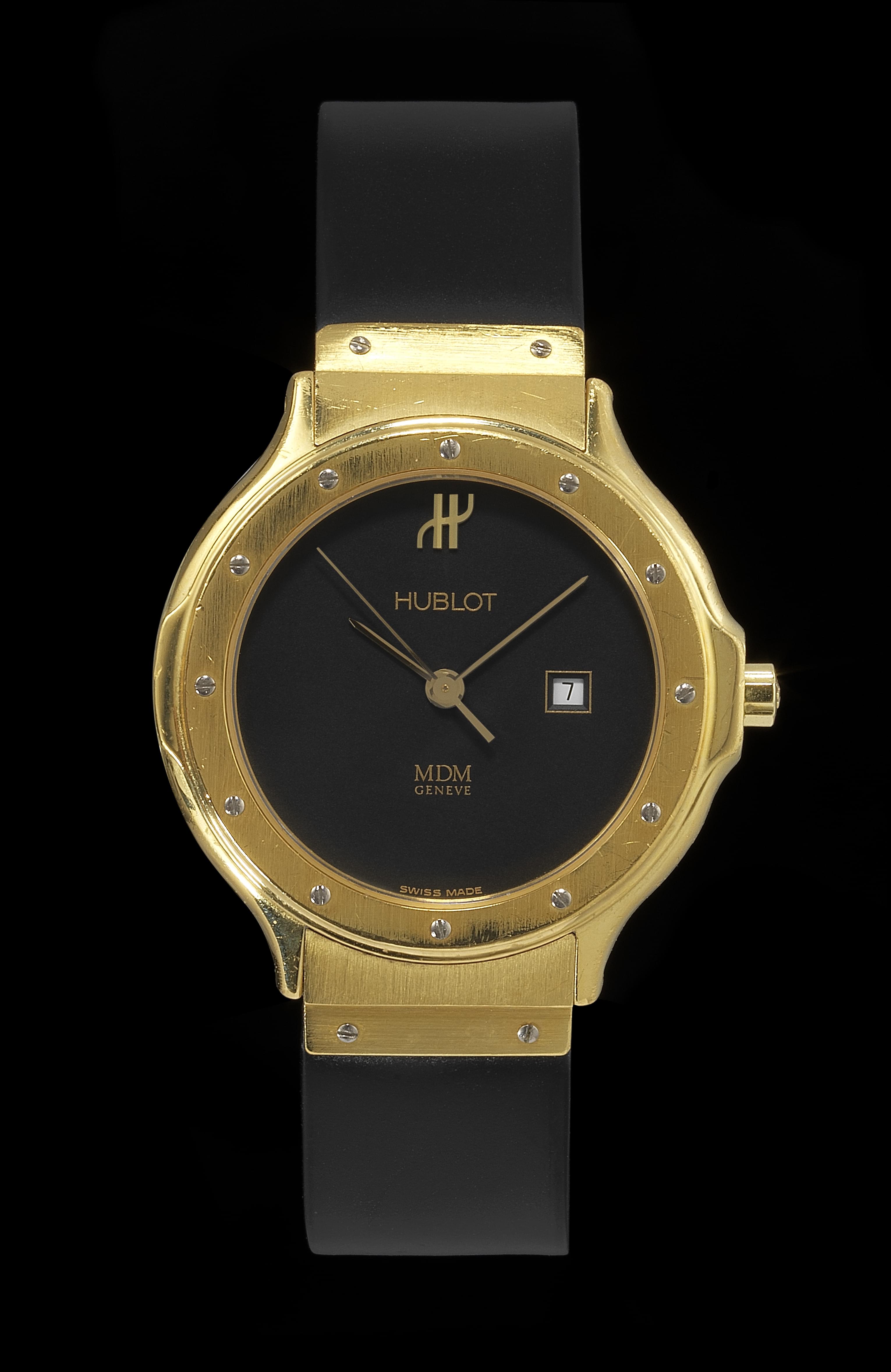 Cadran noir, aiguilles dorées, date à guichet à 3h, or 750, L env. 17 cm, D 31 mm, poids brut 49 g, dans son écrin. Provenance : collection Marisa Perret-Rezzonico