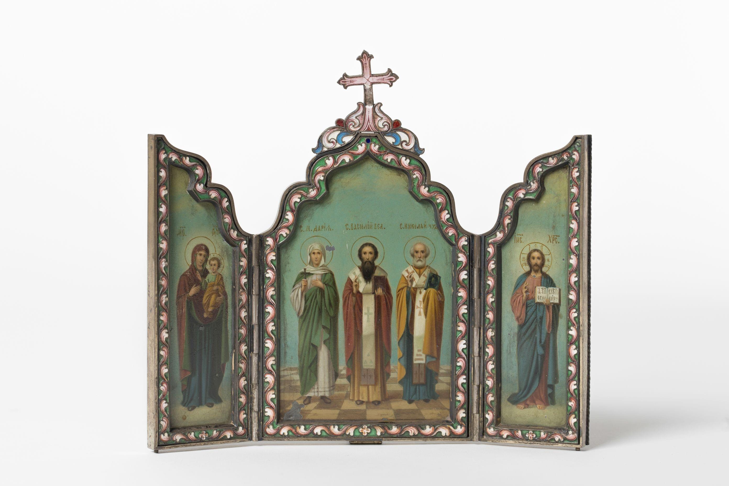 321. Icône tryptique ouvrant sur les figures en pied de Sainte Daria, Saint Basile et Saint Nicolas, le volet présentant la Vierge à l'Enfant et le Christ, émaux cloisonnés et argent, huile sur métal, Russie, début XXe, 84 kokochniks, H 15,5 cm