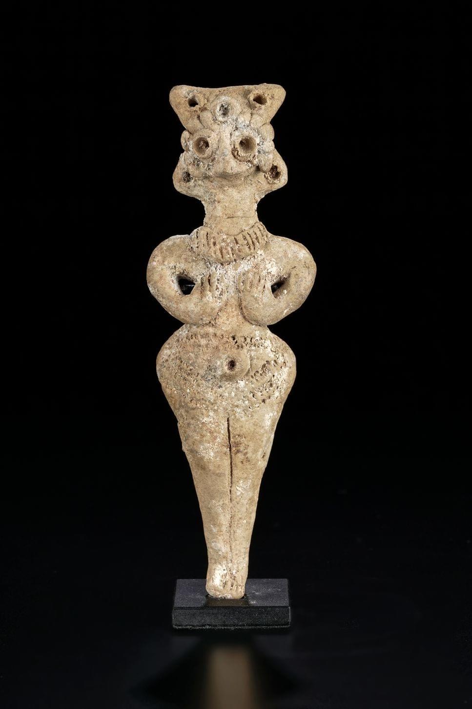 Figurée debout, bras écartés, coiffe percée de trous, argile, H...