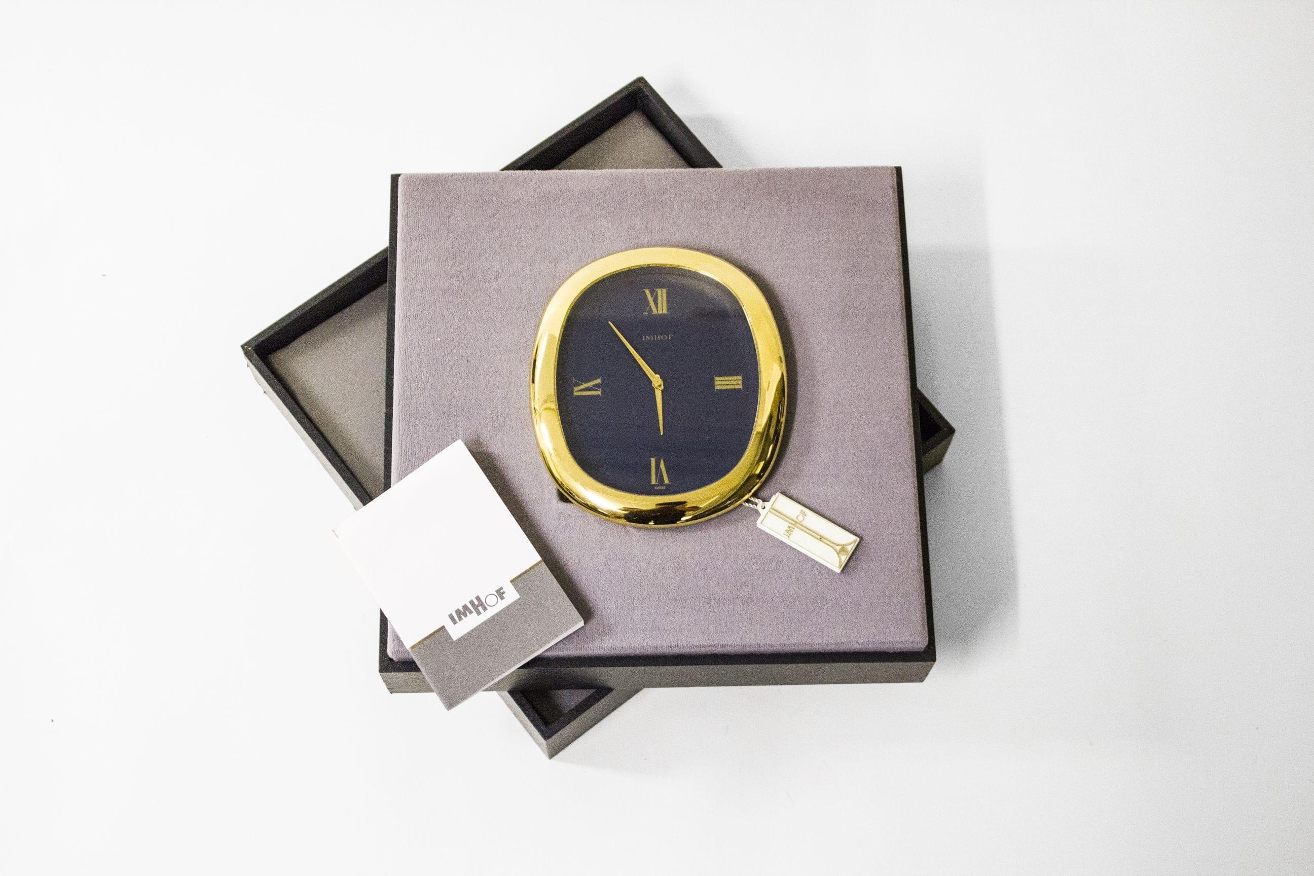 Cadran bleu, aiguilles et chiffres romains dorés, métal doré, 14x12 cm, avec sa boîte et ses papiers de garantie