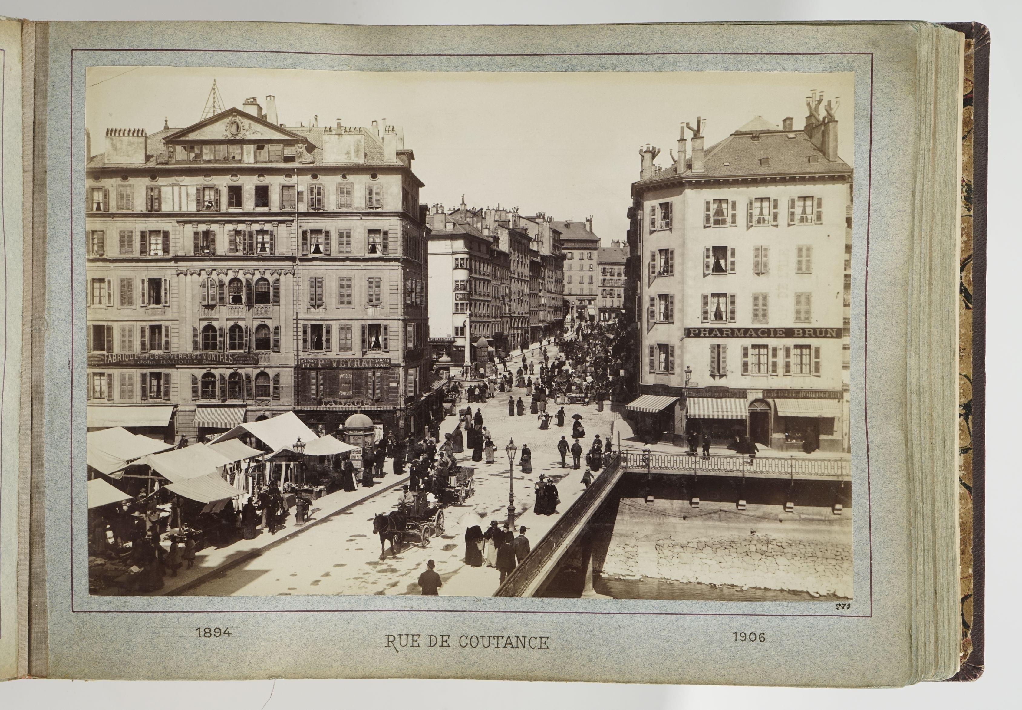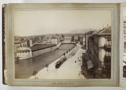 In-4°, oblong, demi-chagrin brun. Epoque de la fin du XIXème siècle. On joint un bel album d’environ 270 cartes postales des années 1900 – 1915, représentant toutes des vues de rues, animées ou non, de la ville de Genève, de monuments, du Rhône à sec, d’un dimanche à Plainpalais