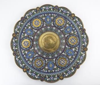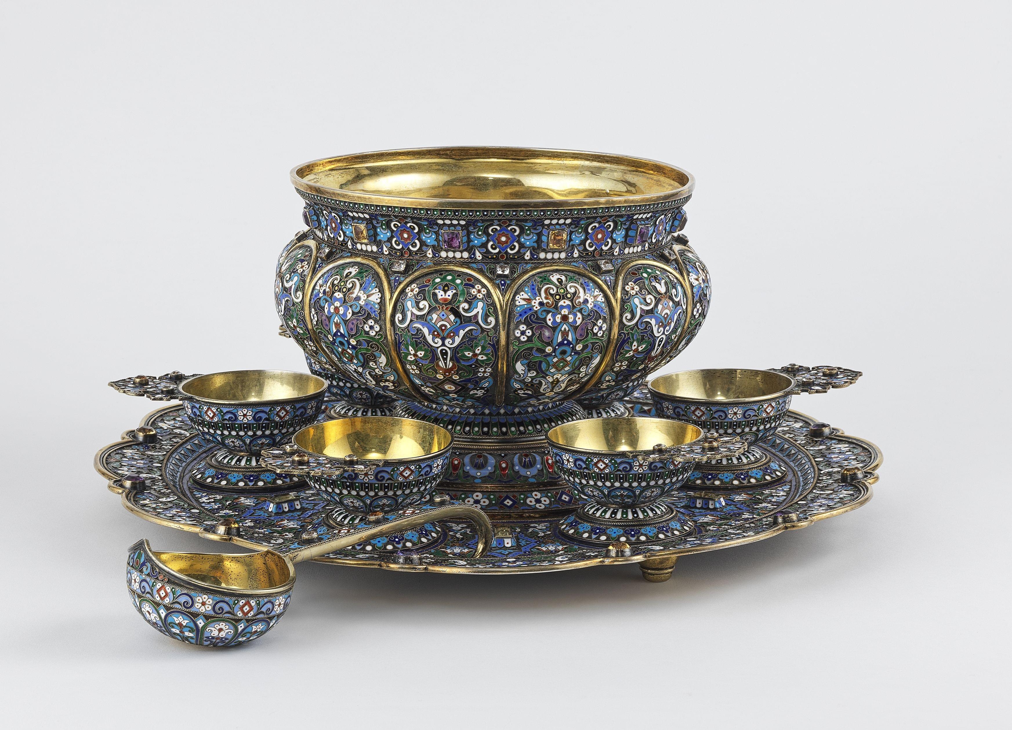 144. Important bol à punch sur présentoir, ses six tasses et son kovsh très richement décorés de rinceaux en émail cloisonné et de cabochons de pierres précieuses et cristal de roche