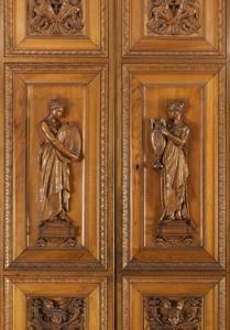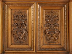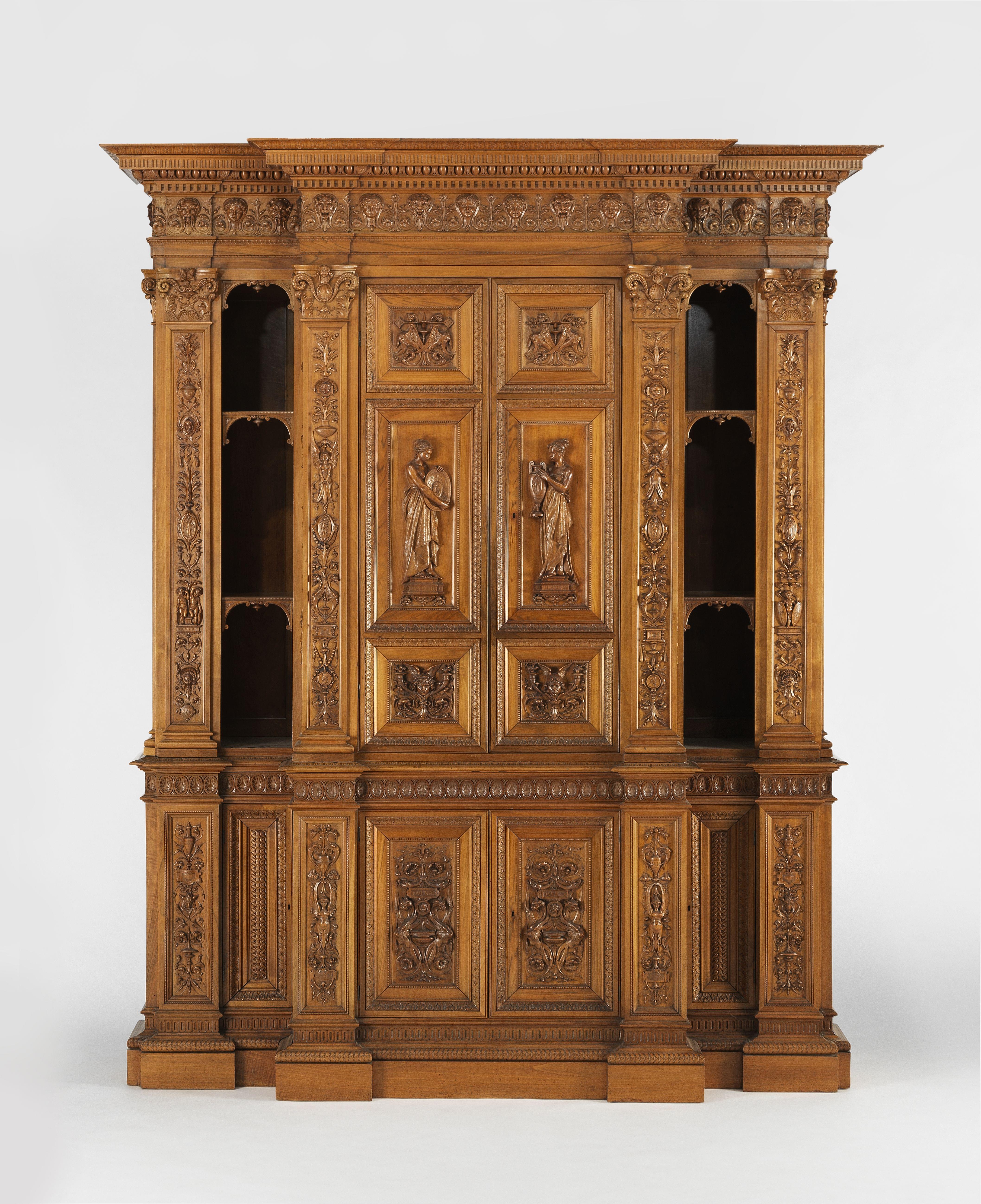 Noyer et bois fruitier sculpté à riche décor sculpté en bas-relief de figures à l'antique, chapiteaux, pilastres et mascarons; au centre, deux vantaux en partie haute et quatre en partie basse, signé C. Pucci, daté et situé Firenze dans des cartouches, 253x208x67 cm. Provenance: Jean-François Graf; couple d'amateurs en Suisse. Littérature: Un cabinet similaire par Carlo Pucci a été exposé à l'Exposition Universelle de Paris de 1878 et illustré dans The Art Journal, London, p 115.