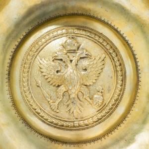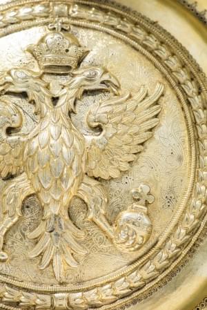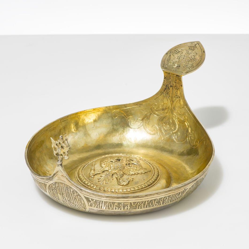 82. Important kovsh de présentation à décor gravé de rinceaux et repoussé au centre de l'aigle bicéphale impériale de Russie