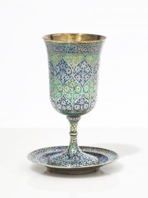 54. Calice et patène à décor d'arabesques turquoise et bleu nuit en...