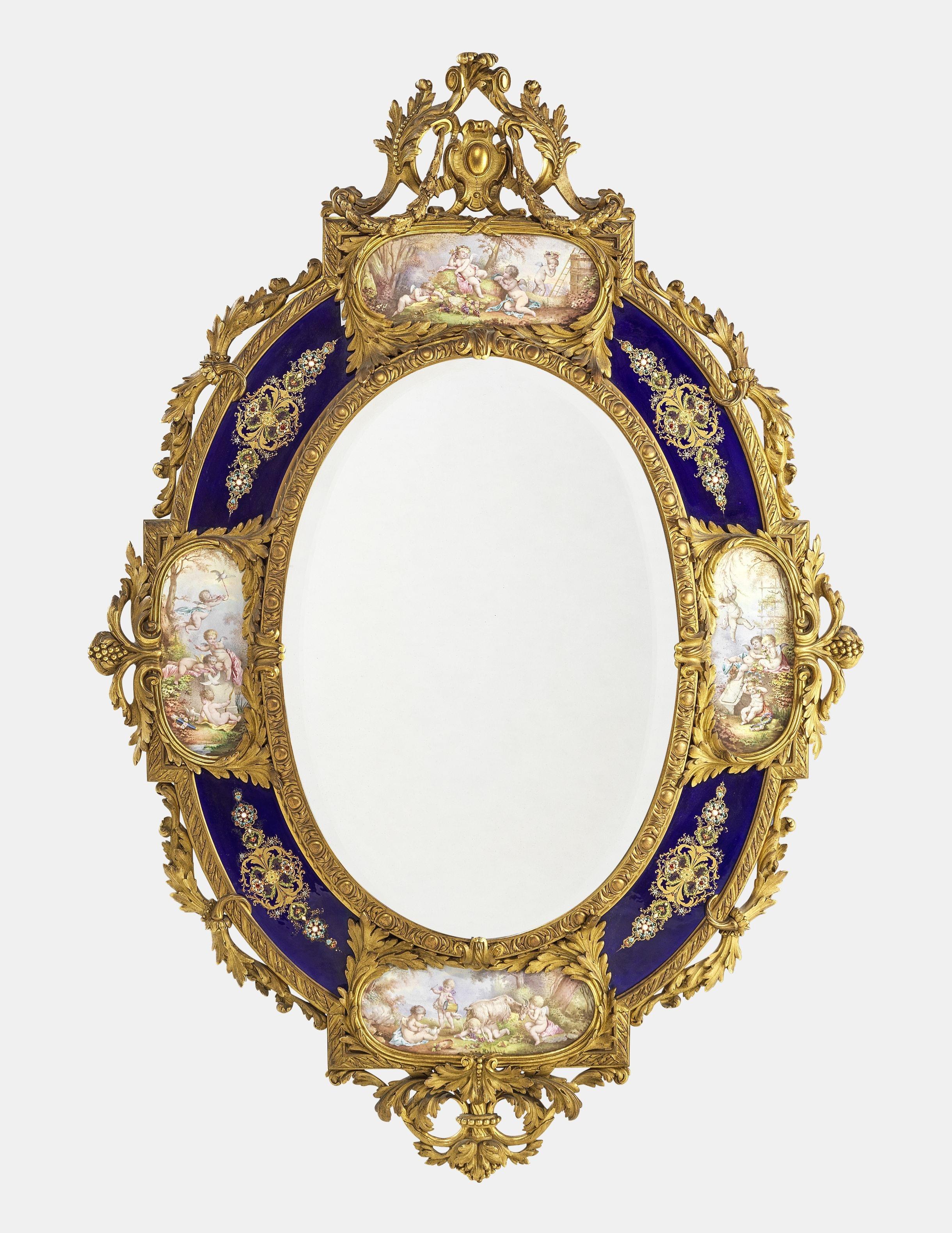 Encadrement formé de plaques de porcelaine alternativement à motifs de scènes galantes et à fond bleu nuit, monture en bronze doré, 118x81 cm