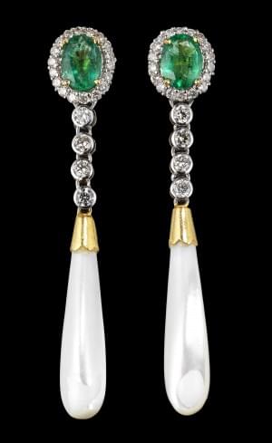 Entourées de diamants retenant deux gouttes de nacre par une lig...