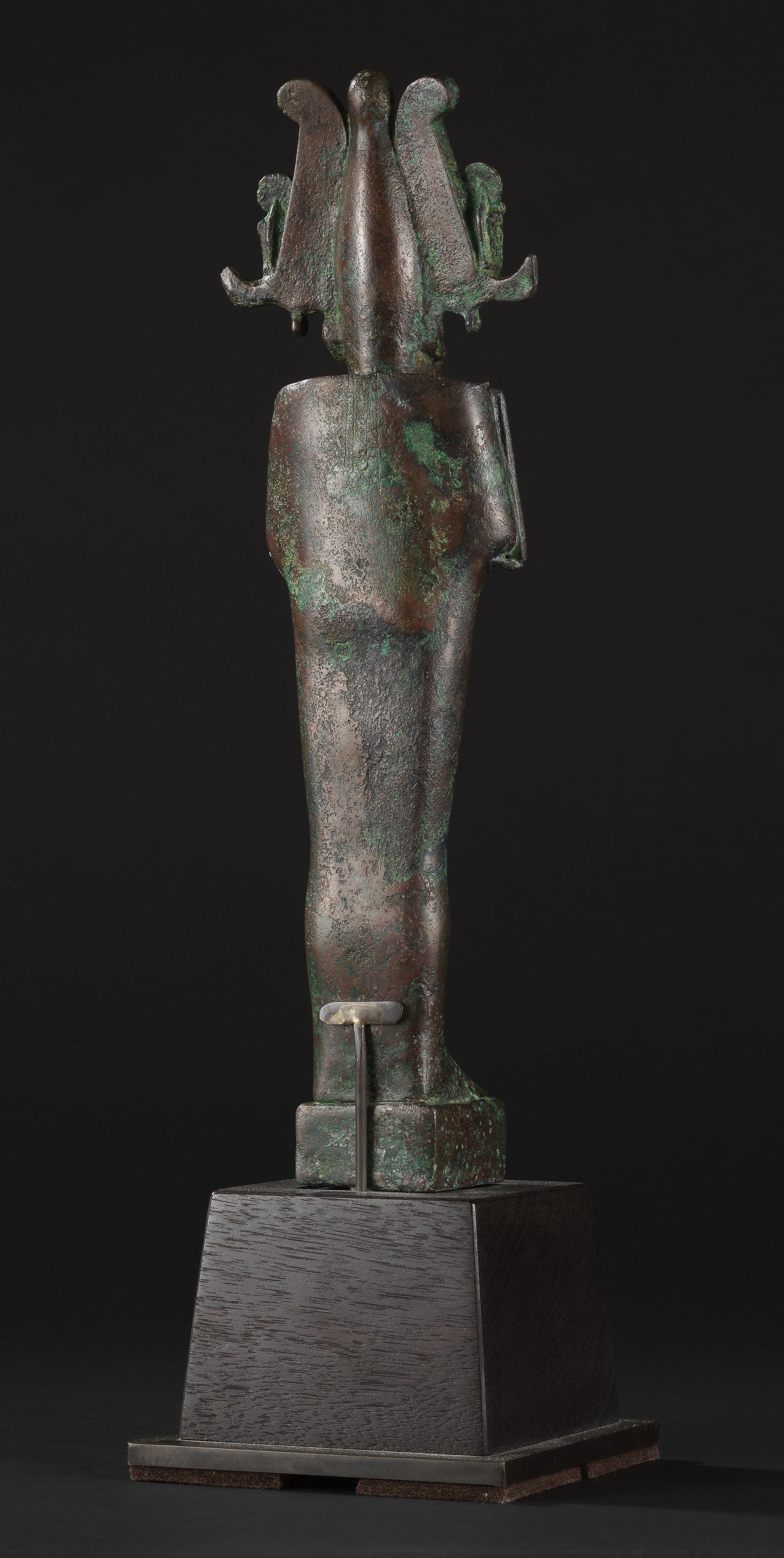 Figuré debout portant la couronne Atef et les attributs de la royauté. Bronze à patine verte, H 31 cm (sans les tenons). Provenance: vente Sotheby's, novembre 1986, lot 48