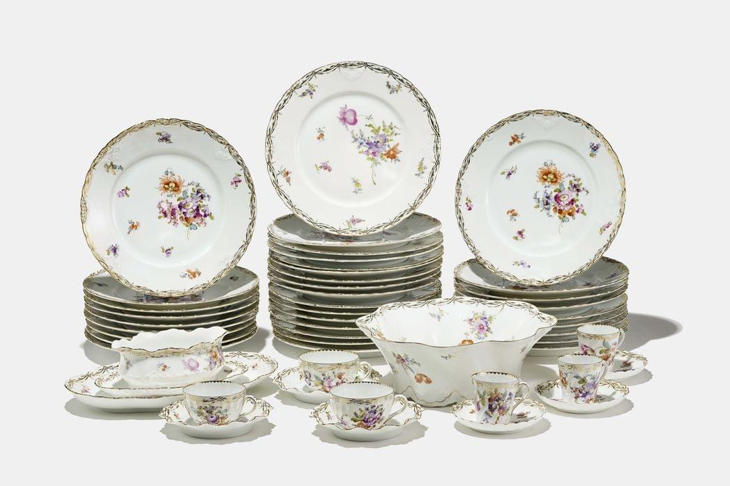 Hermann Ohnme, Silesia, Saxe, circa 1900, porcelaine, comprenant: 50 assiettes à dîner, 18 à dessert, 12 creuses, 12 à pain, 12 tasses à thé, 6 porte-couteaux, 16 pièces de service (126p)