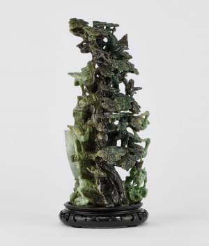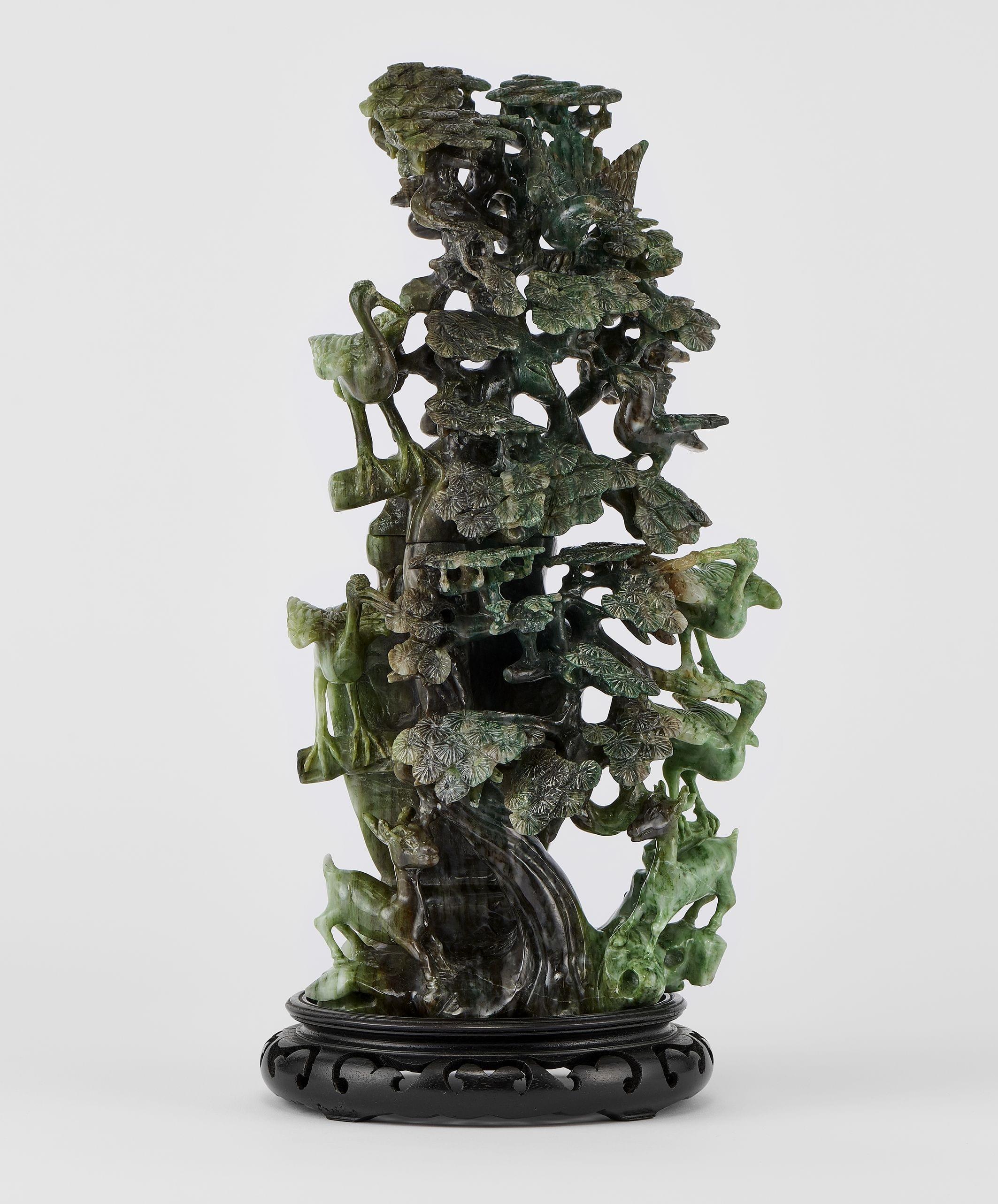 Jade épinard très sculpté et ajouré à décor d'oiseaux et cerfs parmi des fleurs de lotus, H 34,5 cm