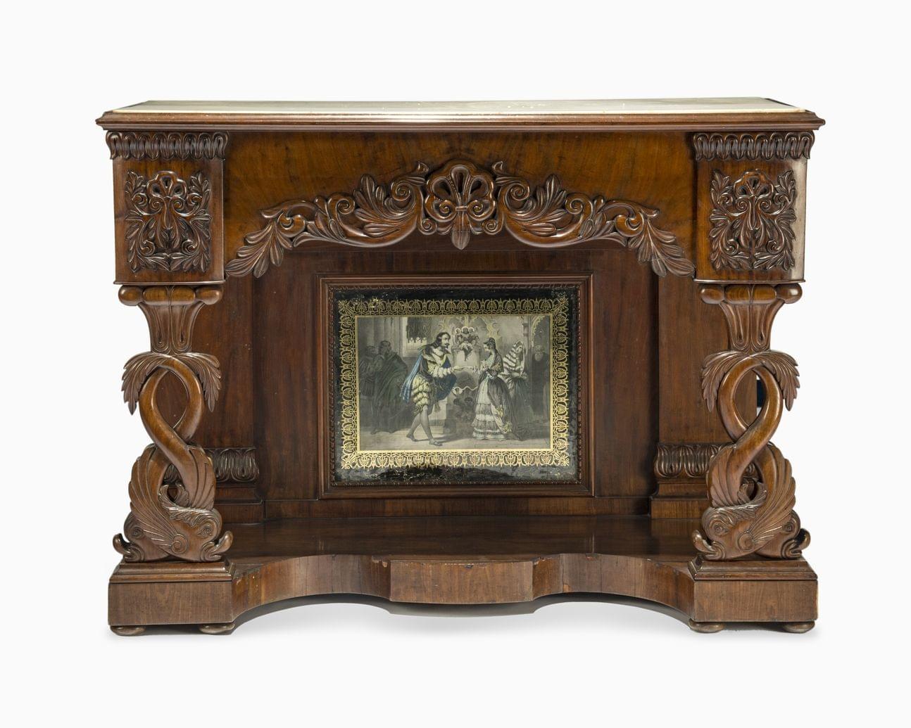 Ceinture et montants sculptés de rinceaux et dauphins, fond orné d'un fixé sous verre figurant une scène galante au XVIIe s, acajou, verre et marbre blanc, 97x131x58 cm