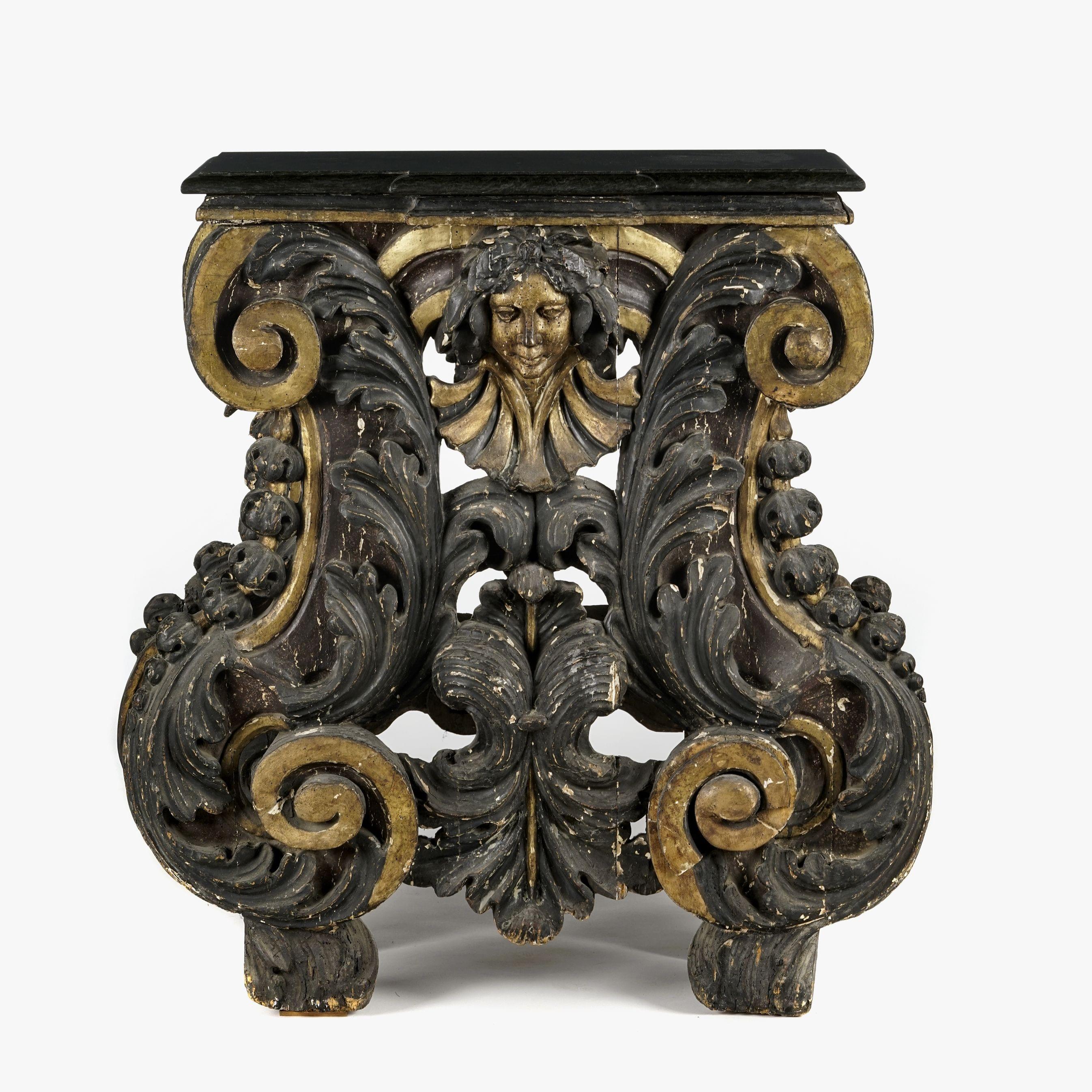 Bois sculpté à décor d'un mascaron, marbre noir, 104x80x42 cm. Collection B. de Saussure