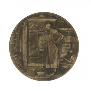 Envoi imprimé du directeur Adrian en février 1907, figure allégorique d'Helvetia sous l'inscription "Laboremus" et date de la décision des chambres pour la construction de l'établissement a. d. VI Jd. Oct. MCMII (ante diem sextum idus octobris 1902), D 8 cm, écrin.