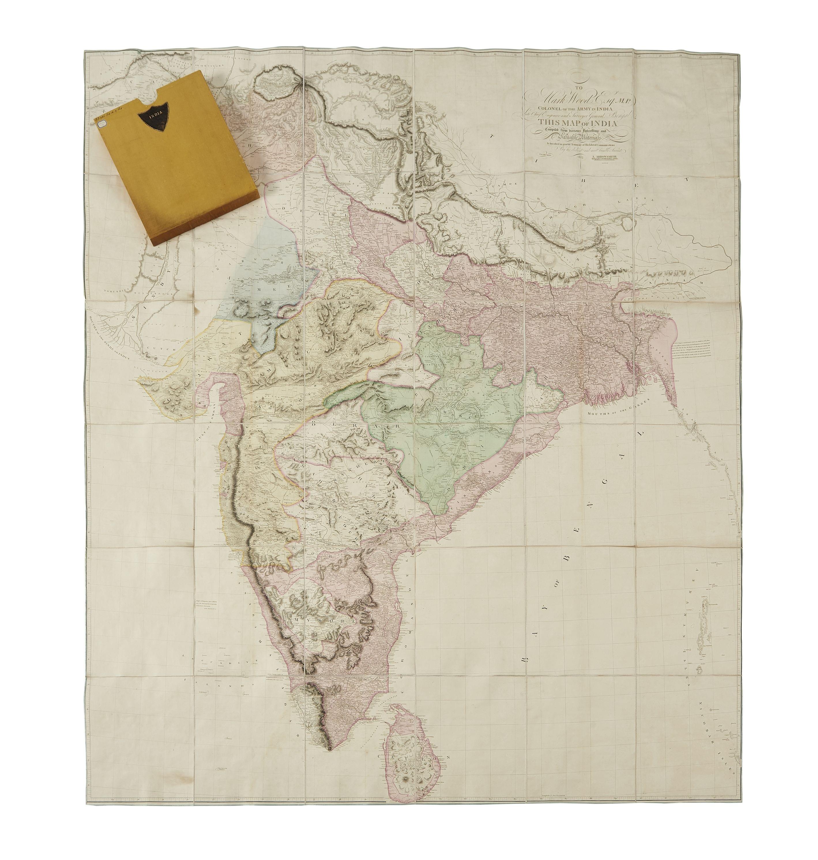 Grande carte dépliante imprimée en noir et réhaussée de couleurs, représentant avec une très grande précision géographique les Indes et l'Ile de Ceylan. Carte entoilée, (192 X 162 cm), étui.